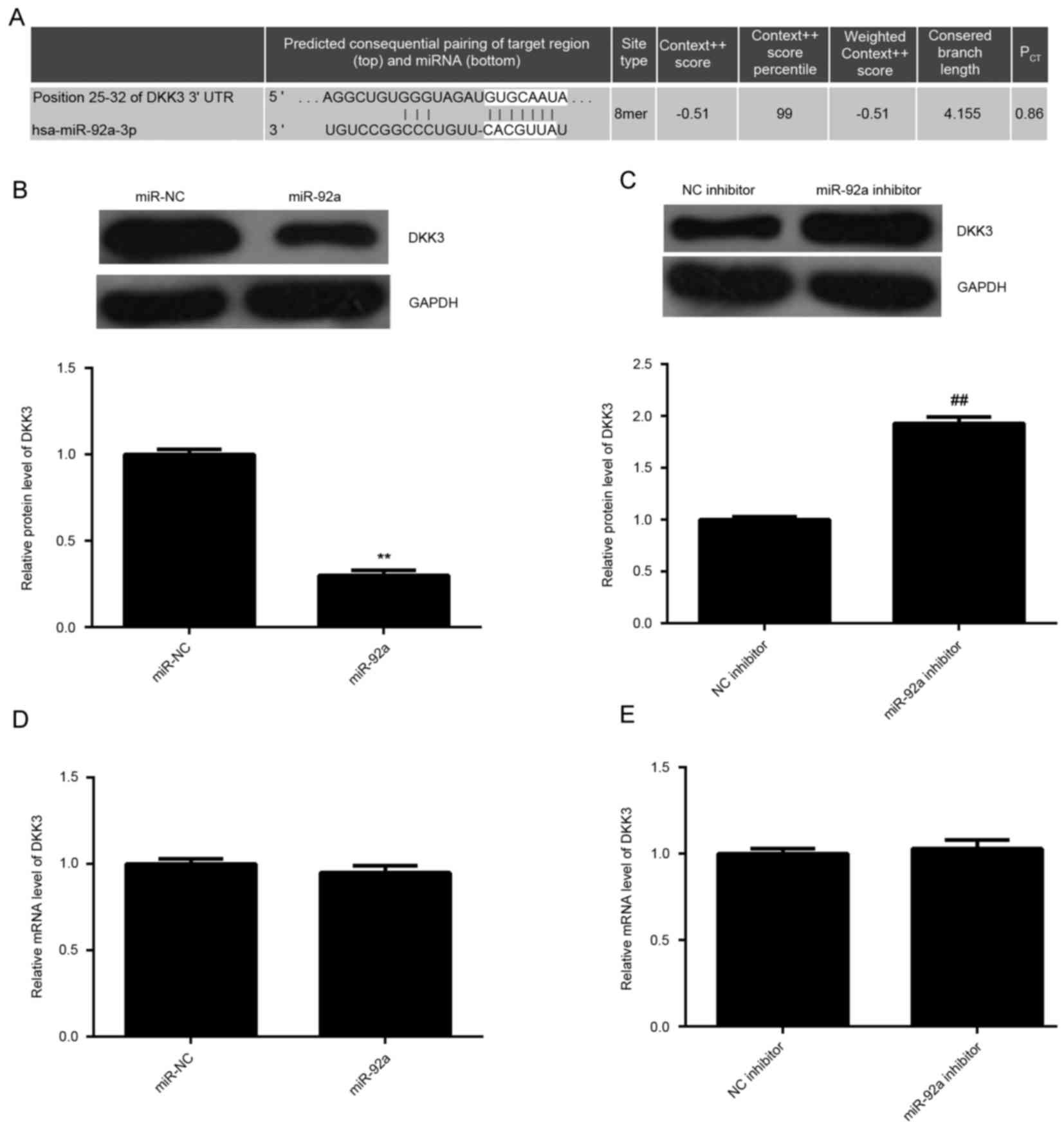 Targetscan (targetscan.org) was used to predict the potential targets of miR-92a, according to the manufacturer's instructions.
