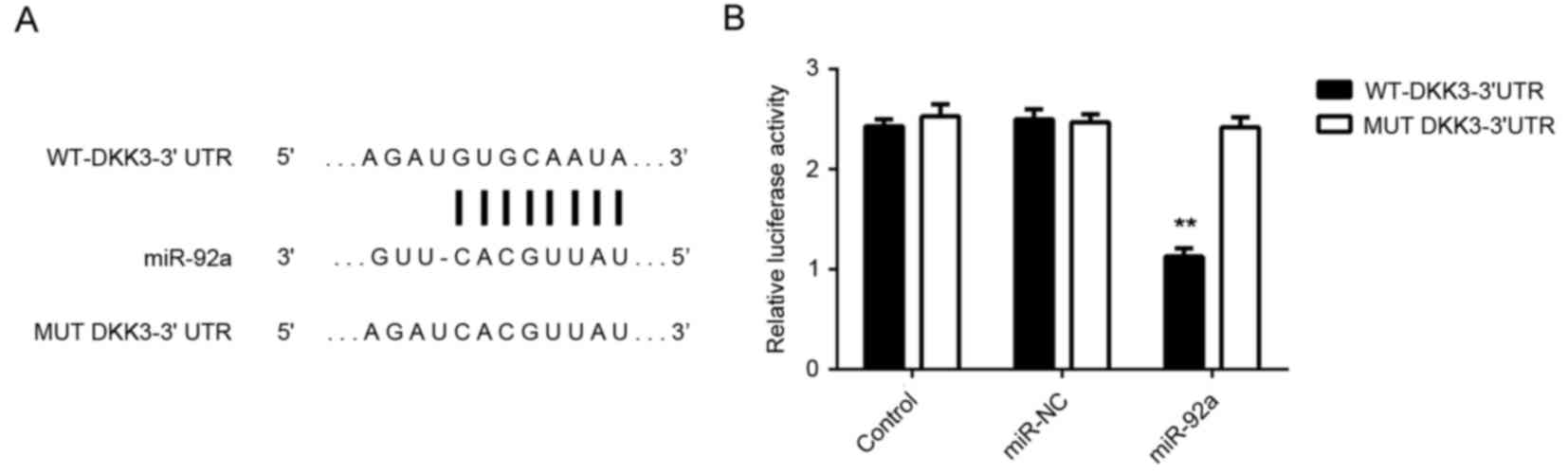 To further investigate these findings, HeLa cells were co-transfected with WT-DKK3-3′UTR or MUT-DKK3-3′UTR luciferase reporter plasmid (Fig. 5A), and miR-92a mimic or miR-NC, respectively. Luciferase reporter assays demonstrated that the luciferase activity was significantly decreased in HeLa cells co-transfected with miR-92a mimic and luciferase reporter vector containing the WT-DKK3-3′UTR compared with the control group (P<0.01). However, no significant difference in activity was observed in HeLa cells co-transfected with miR-92a mimic and luciferase reporter vector containing the MUT-DKK3-3′UTR (Fig. 5B). Therefore, the present findings indicated that DKK3 is a target gene of miR-92a in HeLa cells.