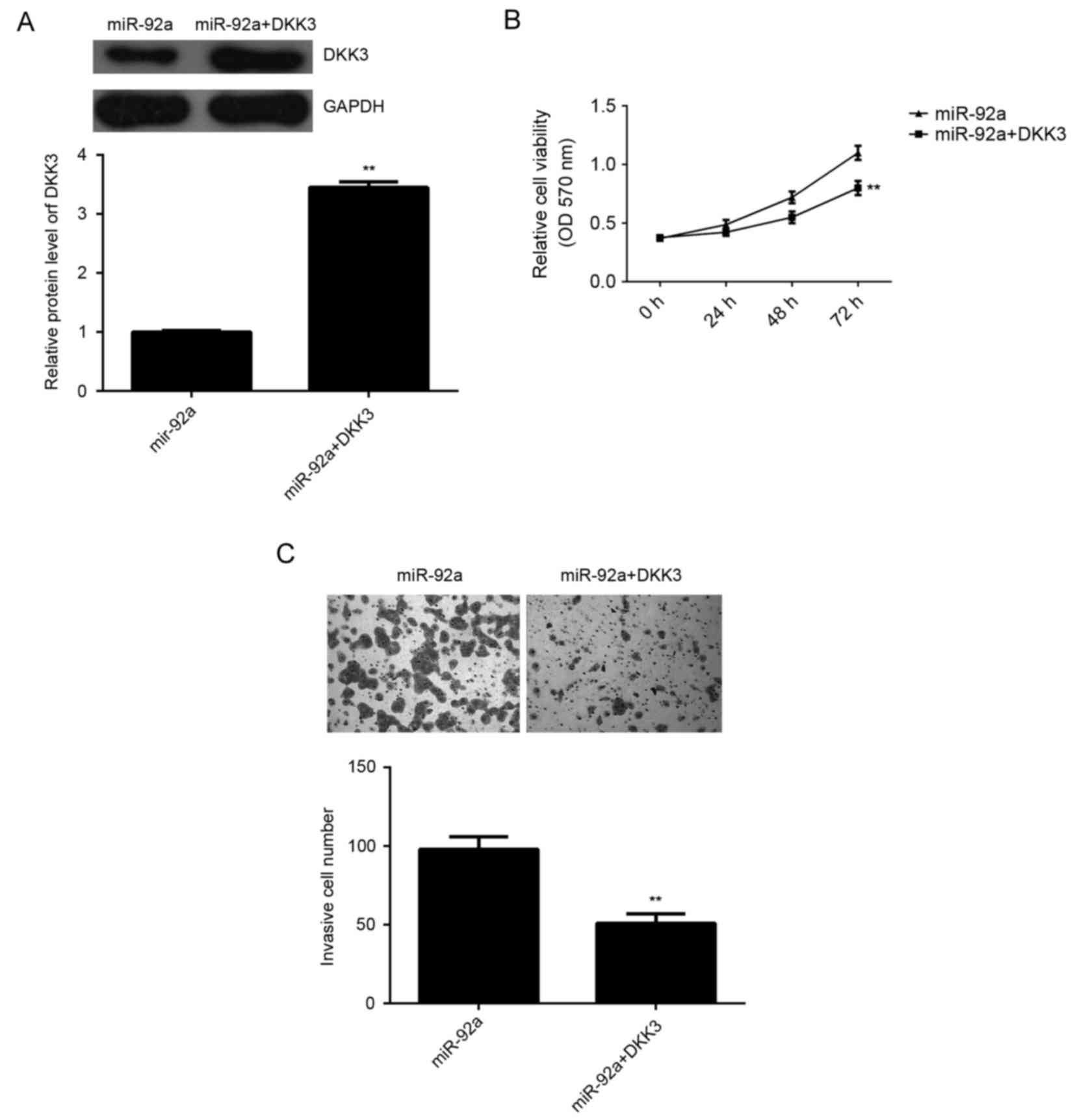 As DKK3 has been demonstrated to act as a tumor suppressor in various types of human cancer such as pancreatic cancer and breast cancer (19,20), DKK3 may be involved in the miR-92a-induced invasion and cell viability of HeLa cells. To explore this speculation, miR-92a-overexpressing cervical cancer cells were transfected with pcDNA3.1-DKK3 expression plasmid. As demonstrated in Fig. 6A, the protein expression levels of DKK3 were significantly increased in the miR-92a + DKK3 group compared with the miR-92a group (P<0.01). MTT assay and Transwell assay were then used to determine the cell viability and invasion capacities, respectively. The data indicated that the viability and invasion of HeLa cells were significantly reduced in the miR-92a + DKK3 group compared with those in the miR-92a group, respectively (P<0.01; Fig. 6B and C). Therefore, overexpression of DKK3 attenuated the stimulative effects of miR-92a on HeLa cell viability and invasion. These findings suggested that the stimulative effects of miR-92a on HeLa cell viability and invasion may be through the inhibition of DKK3 expression.
