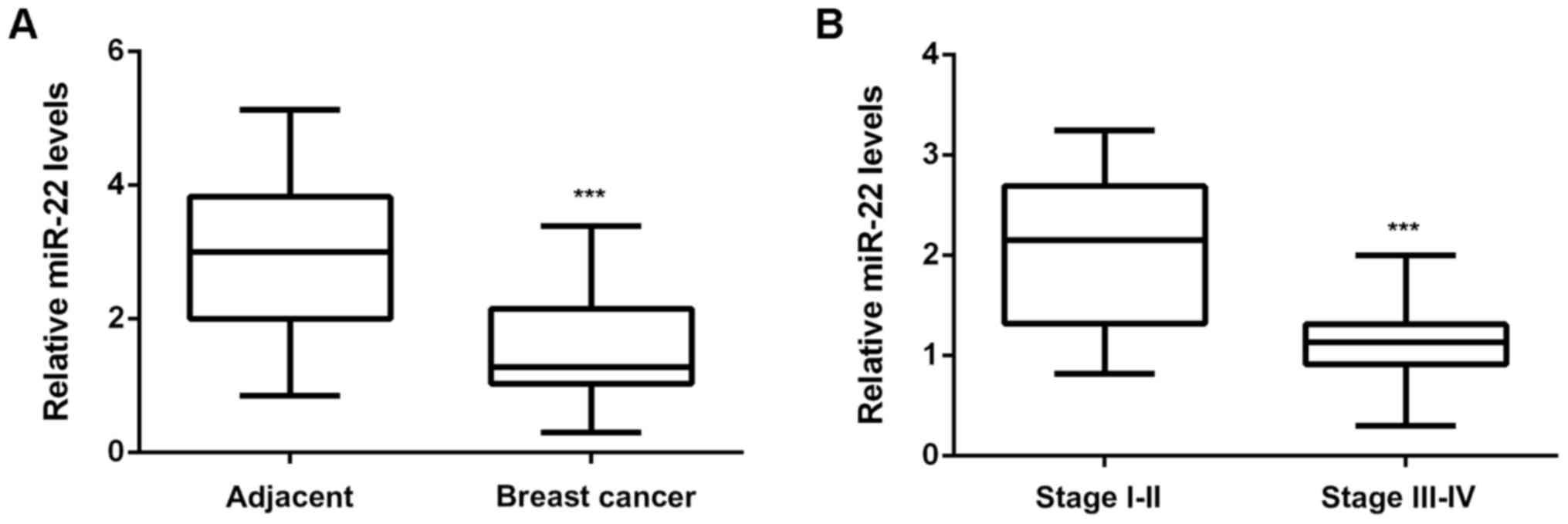 Therefore, this study aimed to investigate the clinical significance of miR-22 expression in breast cancer, as well as the molecular mechanism of miR-22 underlying breast cancer growth and metastasis.