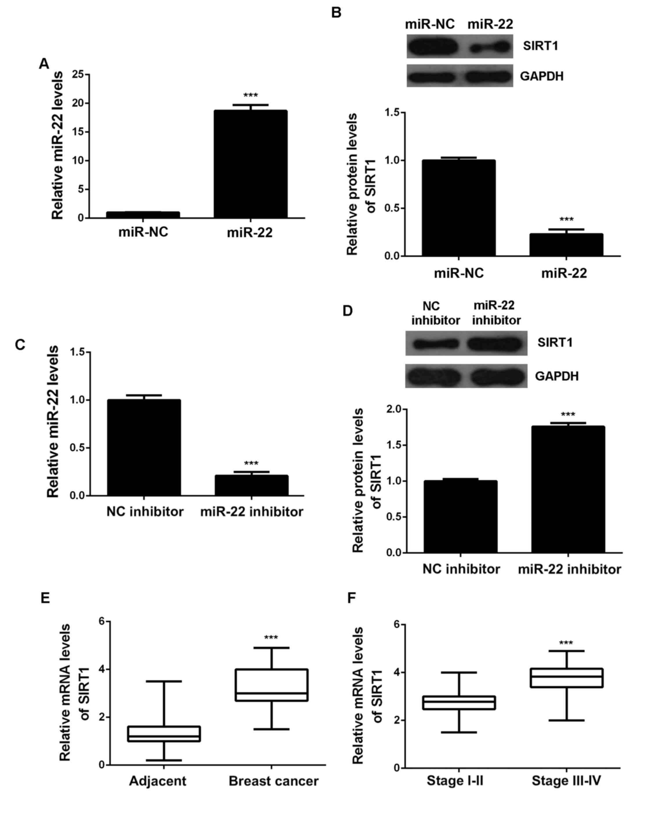 As miRs generally show suppressive effects on the protein expression of their target genes, we then studied the effects of miR-22 on SIRT1 expression in MCF-7 cells. MCF-7 cells were transfected with miR-22 mimic to upregulate its expression, and transfection with miR-NC was used as the control group. After transfection, the miR-22 expression was significantly increased in the miR-22 group compared with the miR-NC group (Fig. 3A). After that, we conducted western blot to determine the protein expression of SIRT1. As indicated in Fig. 3B, overexpression of miR-22 reduced the protein levels of SIRT1. To further confirm these findings, MCF-7 cells were transfected with miR-22 inhibitor to decrease its expression, and transfection with NC inhibitor was used as the control group. As shown in Fig. 3C, the miR-22 levels were significantly reduced in the miR-22 inhibitor group compared with the NC inhibitor group. Moreover, knockdown of miR-22 increased the protein expression of SIRT1 (Fig. 3D). Accordingly, we demonstrate that the protein expression of SIRT1 is negatively regulated by miR-22. After that, we further examined the expression of SIRT1 in breast cancer tissues. qPCR data showed that the SIRT1 levels were significantly higher in breast cancer tissues compared with adjacent non-tumor tissues (Fig. 3E). Moreover, the mRNA levels of SIRT1 were higher in stage III–IV breast cancer, when compared with stage I–II breast cancer. Based on these above data, we suggest that the increased expression of SIRT1 in breast cancer may be due to the downregulation of miR-22.