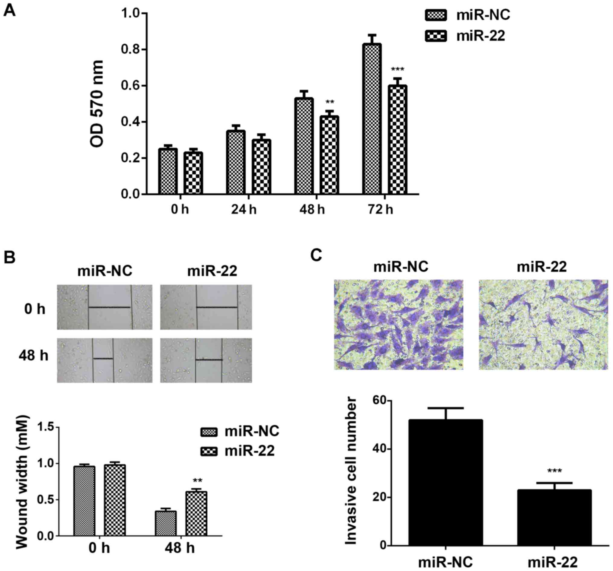 We then studied the regulatory roles of miR-22 in the regulation of breast cancer growth and metastasis in vitro. MTT assay, wound healing assay and transwell assay were conducted to examine the cell proliferation, migration and invasion, respectively. As indicated in Fig. 4A-C, ectopic expression of miR-22 led to a significant decrease in the proliferation, migration and invasion of MCF-7 cells, suggesting that miR-22 may have suppressive effects on breast cancer growth and metastasis.
