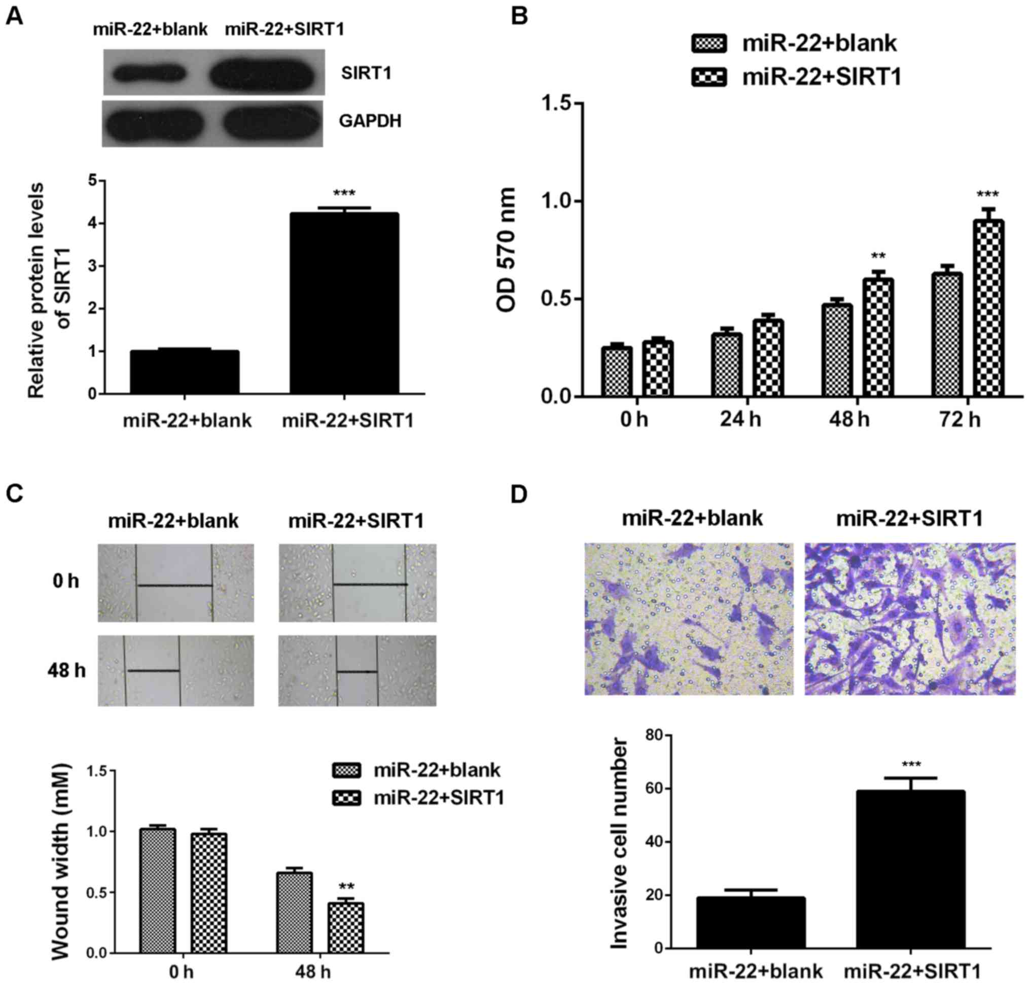 As we found that SIRT1 was upregulated in breast cancer and negatively regulated by miR-22 in MCF-7 cells, we speculated that SIRT1 might be involved in the miR-22-mediated proliferation, migration and invasion of MCF-7 cells. To verify this speculation, miR-22-overexpressing MCF-7 cells were transfected with pcDNA3.1-SIRT1 expression plasmid. After transfection, the protein levels of SIRT1 were remarkably increased in the miR-22+SIRT1 group compared with the miR-22 group (Fig. 5A). Further investigation showed that the proliferation, migration and invasion of MCF-7 cells were also upregulated in the miR-22+SIRT1 group, when compared with those in the miR-22 group, indicating that restoration of SIRT1 attenuated the suppressive effects of miR-22 on the malignant phenotypes of MCF-7 cells (Fig. 5B-D). Taken these data together, we suggest that the tumor suppressive role of miR-22 in MCF-7 cells is, partly at least, through directly inhibiting the protein expression of SIRT1.