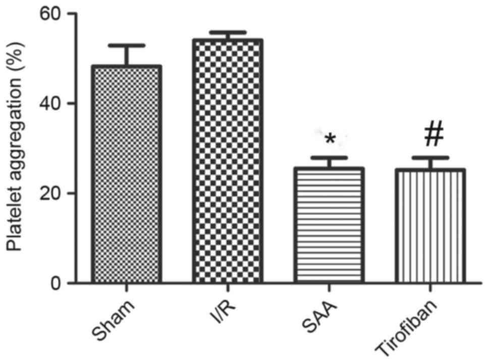 Platelets serve critical roles in I/R injury. Following reperfusion, platelet contact with subendothelial collagen stimulates platelet adhesion and activation (18). Activated platelets generate a variety of factors that induce a feed forward loop to reinforce the activation process. For instance, thromboxane A2 enhances platelet activation and adhesion, while ADP and thrombin recruit circulating platelets and promote platelet aggregation. Concomitant with these events, tissue factor XIII is activated to promote the formation of clots (both large thrombi and small platelet microthrombi). In the present study, SAA exhibited strong antiplatelet activity, as observed in an in vitro platelet aggregation assay. The in vitro experiments of the present study demonstrated that treatment with SAA significantly decreased ADP-induced platelet aggregation, eliciting an inhibitory effect similar to Tirofiban. Therefore, SAA may reduce coronary thrombus by inhibiting platelet activation and improving coronary blood flow.