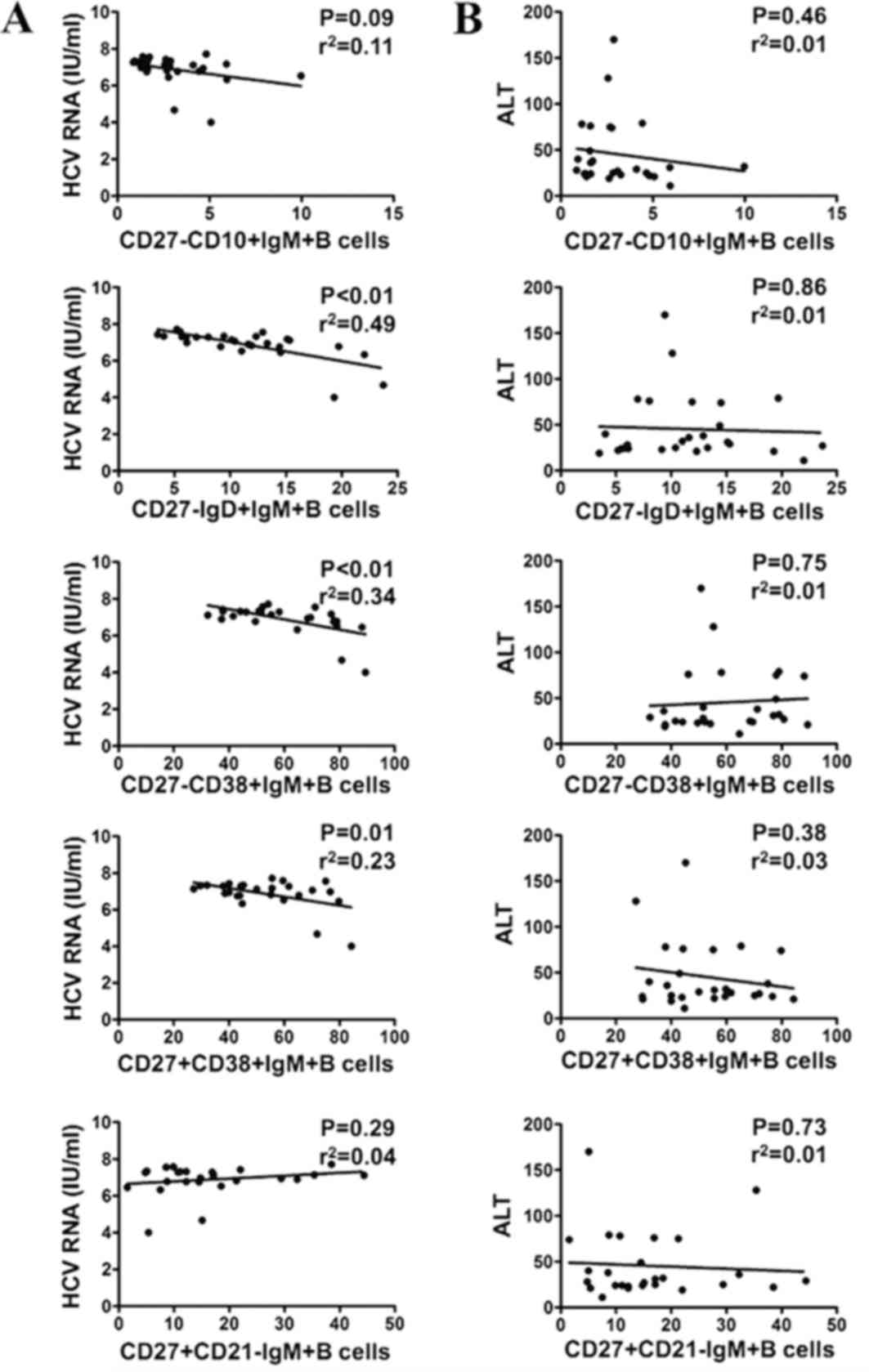 In order to evaluate the association between IgM+B cell subsets and clinical parameters in patients with CHC, it was investigated whether IgM+B subsets were correlated with HCV RNA and the liver cell damage marker ALT. As presented in Fig. 5A, the percentages of CD27-IgD+IgM+B cells (P<0.01, r2=0.49), CD27-CD38+IgM+B cells (P<0.01, r2=0.34) and CD27+CD38+IgM+B cells (P=0.01, r2=0.23) were negatively correlated with viral load in patients with CHC. However, no significant correlations between any IgM+B cell subsets and ALT were detected in patients with CHC (Fig. 5B). Thus, these data indicate that there is a HCV but not ALT is negatively correlated with the abnormal expression of certain IgM+B cell subsets.