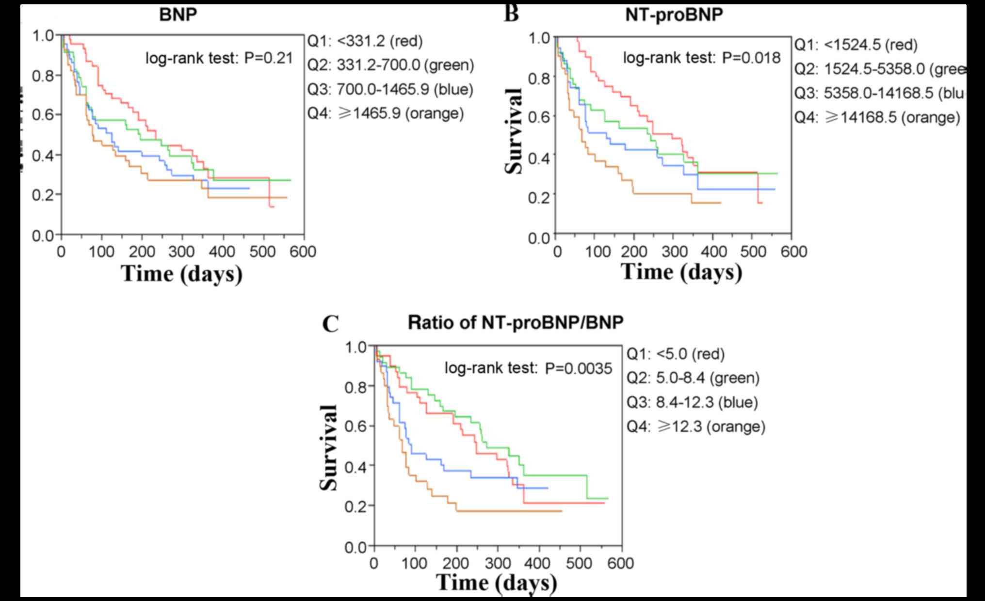 All BNP [700.0 (331.2–1,465.9) vs. 1613.7 (997.6–1,981.4), P<0.05], NT-proBNP [5,358 (1,525–14,169] vs. 18,449 (9,068–41,093), P<0.01] and the ratio of NT-proBNP to BNP [8.4 (5.0–12.3) vs. 17.6 (7.3–28.3), P<0.01] were significantly increased in the patients who succumbed to HF, compared with those who remained alive while in hospital (Fig. 1). Logistic regression analysis including NT-proBNP/BNP, NT-proBNP and BNP indicated that the NT-proBNP/BNP ratio was the only independent predictor of in-hospital mortality (Table III). The Kaplan-Meier survival curves for all-cause mortality and readmission are presented in Fig. 2 for BNP, NT-proBNP and the NT-proBNP/BNP ratio, respectively. Quartiles of NT-proBNP and the NT-proBNP/BNP ratio significantly differed (log-rank test, P=0.018 and P=0.0035, respectively), whereas those of BNP (log-rank test, P=0.21) did not. Cox proportional-hazard models of long-term outcomes including NT-proBNP/BNP, NT-proBNP and BNP indicated that the NT-proBNP/BNP ratio remained the only independent predictor of long-term outcomes (Table IV).