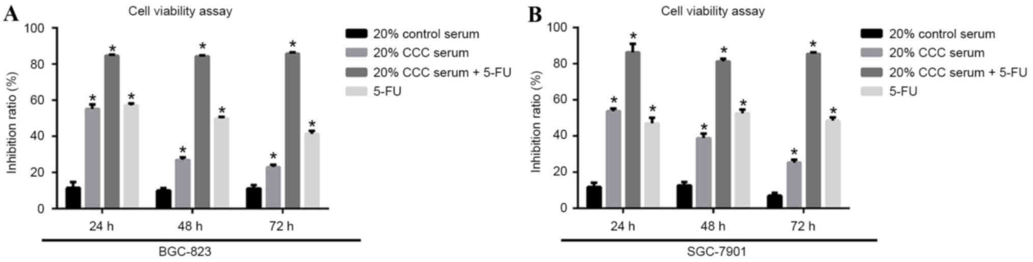 In the BGC-823 and SGC-7901 cell lines, CCC serum therapy, 5-FU and combined therapy, which consisted of 20% CCC serum + 5-FU, demonstrated significant inhibition to cell viability (P<0.05) compared with the control serum group (Fig. 3). Combined therapy provided a significantly increased and stable inhibition rate of >80% when compared with the control group over the 72-h observation time (P<0.05). In both of the cell lines, combined therapy resulted in a superior inhibition rate when compared with 20% CCC serum or 5-FU treatment alone (P<0.05; Fig. 3).