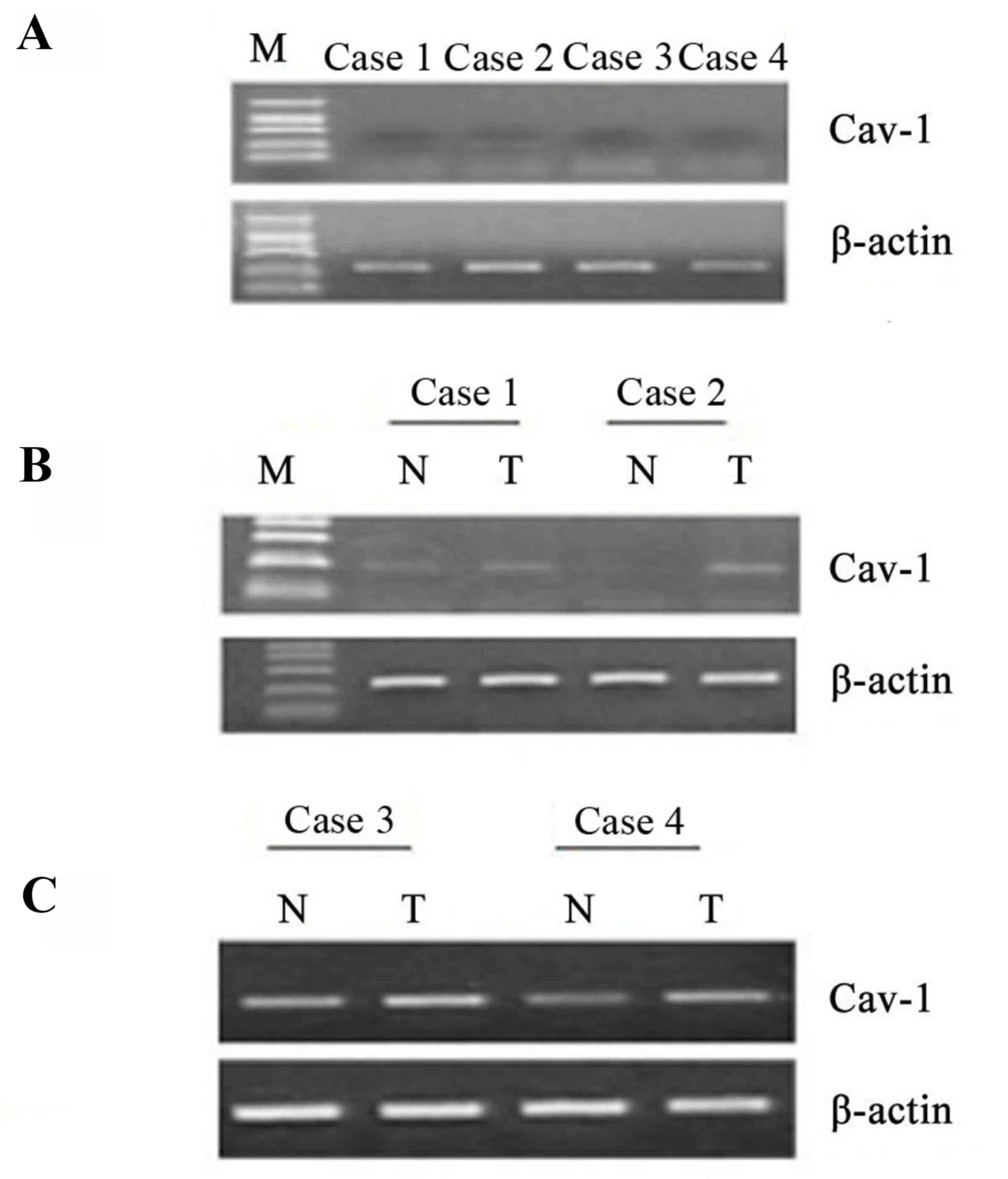 The cycle number was set to 28, 30, 34 and 36 to determine the plateau (22). cDNA were synthesized using a Reverse Transcription System (Promega Corp., Madison, WI, USA), according to the manufacturer's protocol. Total RNA (1 µg) was reverse transcribed to first-strand cDNA in 20 µl of mixture containing 25 mM MgCl2 (4 µl), reverse transcription 10X buffer (2 µl), 10 mM dNTP mixture (2 µl), recombinant RNase inhibitor (0.5 µl), AMV reverse transcriptase (15 µl and Oligo (dT) primers (0.5 µg). The reaction conditions were as follows: 42°C for 60 min, followed by 95°C for 5 min. Semi-quantitative analysis for the expression of Cav-1 mRNA was performed using RT-PCR technique and β-actin used as an internal control (22). PCR was performed using the following program: 94°C for 5 min, followed by 30 cycles of 94°C for 30 sec, 58°C for 60 sec and 72°C for 45 sec. The primers for RT-PCR were as follows: Cav-1, forward 5′-GACTTTGAAGATGTGATTGC-3′ and reverse 5′-AGATGGAATAGACACGGCTG-3′; and β-actin, forward 5′-CTACAATGAGCTGCGTGTGGC-3′ and reverse 5′-CAGGTCCAGACGCAGGATGGC-3′. The PCR products were 254 and 275 bp, respectively. RT-PCR was performed using a DNA thermal cycler MJ Research PTC-200 (Bio-Rad Laboratories, Inc., Hercules, CA, USA). The PCR samples were analyzed using a 1% agarose gel and visualized by ethidium bromide staining. The intensity of the bands was measured by densitometry utilizing Tobias TBX1000 scanning densitometer (Tobias Associates, Inc., Miami Beach, FL, USA).