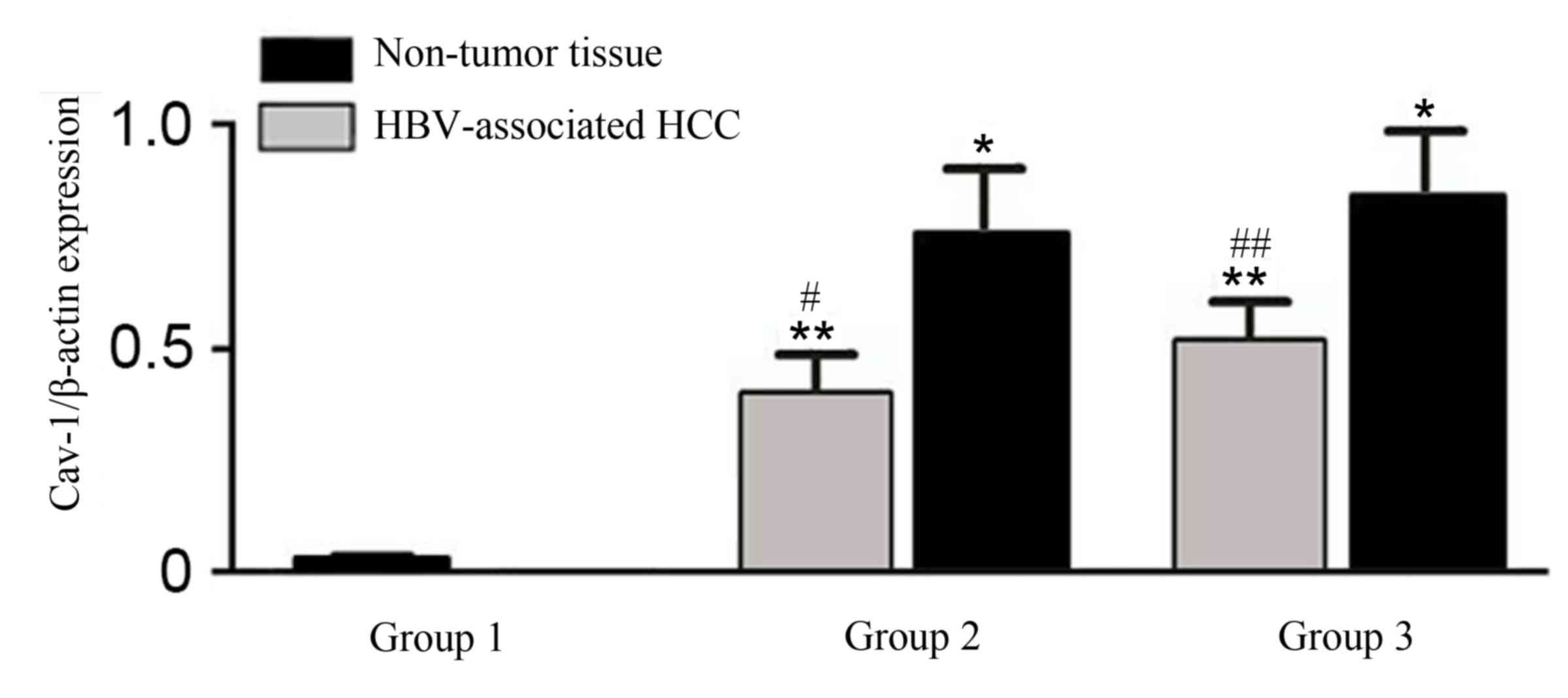 The aim of the present study was to investigate the expression and significance of Cav-1 in HBV-associated HCC. TRIzol reagent was used for RNA extraction; semi-quantitative reverse transcription-polymerase chain reaction (RT-PCR) and the mRNA expression evels of Cav-1 mRNA were detected. Immunohistochemistry analysis and microvessel counting was used for exploring the expression of Cav-1, cluster of differentiation (CD)34 and vascular endothelial growth factor (VEGF).