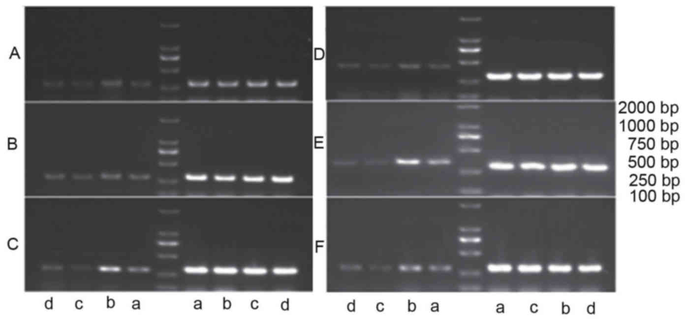 All data were expressed as the mean ± standard deviation. One-way analysis of variance was used to analyze data, using the SPSS software (version 19.0; IBM SPSS, Armonk, NY, USA). A 2:2 comparison was made using Fisher's least significant difference. P<0.05 was considered to indicate a statistically significant difference.