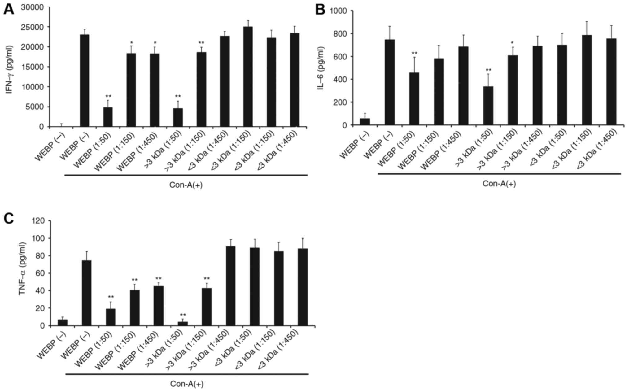 In Fig. 2, IFN-γ, IL-6 and TNF-α secretion after Con-A stimulation with WEBP treatment has shown a dose-dependent manner. Furthermore, IFN-γ levels treated with WEBP diluted at 1:50, 1:75 and 1:150 in water were determined to confirm about a concentration-response between 1:50 and 1:150. The IFN-γ levels treated with WEBP diluted at 1:50, 1:75 and 1:150 in water were 5,283±116 (mean ± SD), 12,223±238 and 18,870±326 pg/ml, respectively. IFN-γ levels were suppressed linearly by treatment with WEBP under 1:150 dilution.