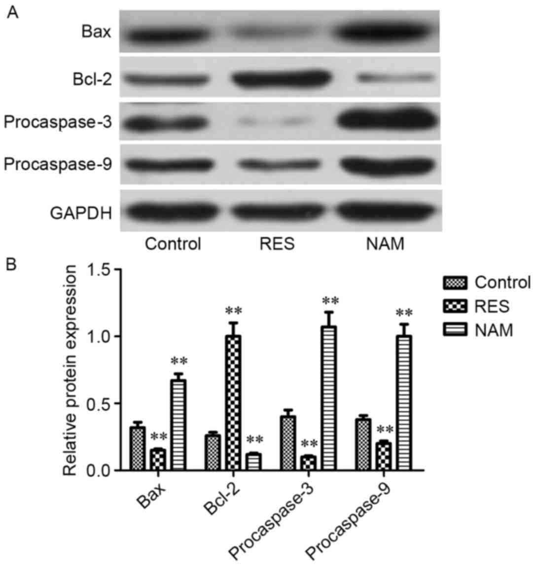 RES is a natural phytoalexin and has been demonstrated to be an effective stimulator of Sirt1 expression in response to OA chondrocyte metabolism, apoptosis and proliferation (15,16,19). Consistent with previous studies, the present study observed that the levels of Sirt1 mRNA and protein were significantly increased in OA chondrocytes treated with RES. Sirt1 has been confirmed in vitro and in vivo to be essential in the prevention of apoptosis in human chondrocytes, which is associated with cartilage degeneration in OA, via the mitochondrial-related pathway (20,21). Following exposure to RES, the present findings demonstrated that increased Sirt1 expression had a lower apoptotic rate compared with the control, indicating that Sirt1 may promote OA chondrocyte survival. Further experiments evaluated the association of Sirt1 with the mitochondrial-related apoptotic pathway. As in mitochondria, the balance between proapoptotic members (such as Bax) and antiapoptotic members (such as Bcl-2) in the Bcl family determines cellular apoptosis and survival. Therefore, the effect of Sirt1 on the protein expression levels of Bax, Bcl-2, procaspase-3 and −9 was surveyed. In line with previous findings, Sirt1 inhibited the expression of Bax, procaspase-3 and procaspase-9 and increased Bcl-2 expression (20), indicating that Sirt1 induced the apoptosis of OA chondrocytes treated with RES through the mitochondria pathway.