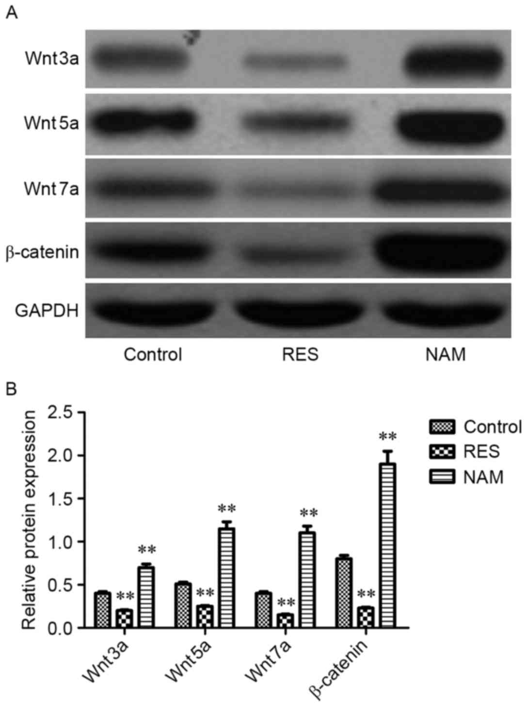 In conclusion, the present study used RES-treated chondrocytes to monitor a number of critical factors in the progression of OA, and demonstrated that RES may increase Sirt1, leading to a decrease in the expression levels of Bax, procaspase-3 and −9, MMP1, MMP3, MMP13, Wnt3a, Wnt5a, Wnt7a and β-catenin and an increase in the level of Bcl-2. These results demonstrate that Sirt1 may regulate the apoptosis and ECM degradation in RES-treated osteoarthritis chondrocytes via the Wnt/β-catenin signaling pathway.