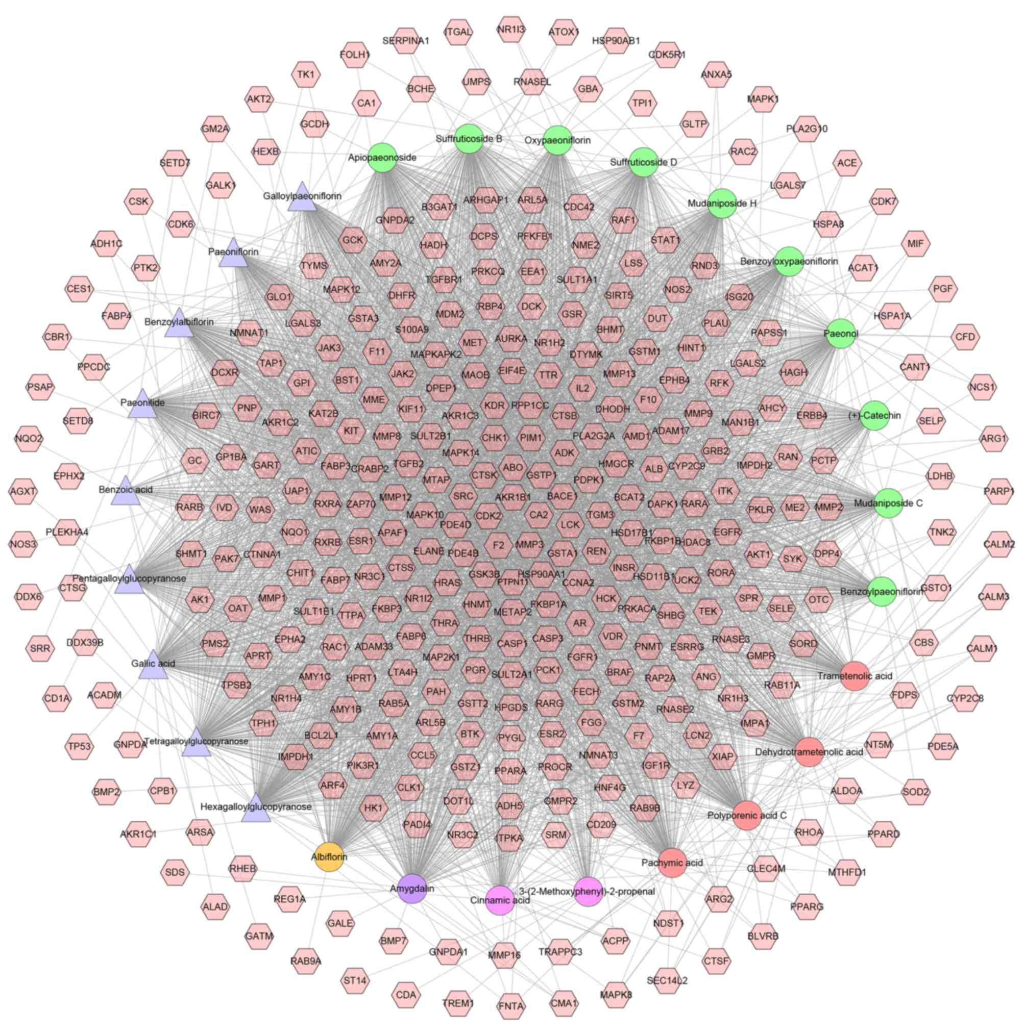 To collect data on the compounds of GFW, the TCM Database@Taiwan (http://tcm.cmu.edu.tw/zh-tw/), as a comprehensive TCM database previously used to identify TCMs for osteoarthritis (23), and the Traditional Chinese Medicine Systems Pharmacology Database (ibts.hkbu.edu.hk/LSP/tcmsp.php), as a systems pharmacology platform for Chinese herbal medicines (24), were used, along with related literature (25). A total of 565 herbal compounds were identified; 230 in Cinnamomi Ramulus, 55 in Poria Cocos (Schw.) Wolf., 78 in Cortex Moutan, 135 in Radix Paeoniae Rubra and 67 in Persicae Semen. Combined with related literature (25), 28 active compounds were identified: Cinnamic acid, cinnamic aldehyde, 3-(2-methoxyphenyl)-2-propenal, polyporenic acid C, pachymic acid, dehydrotrametenolic acid, trametenolic acid, gallic acid, oxypaeoniflorin, (+)-catechin, apiopaeonoside, paeonilide, paeoniflorin, suffruticoside B, suffruticoside D, galloylpaeoniflorin, tetragalloylglucopyranose, pentagalloylglucopyranose, benzoic acid, mudanpioside H, hexagalloylglucopyranose, benzoyloxypaeoniflorin, mudanpioside C, benzoylalbiflorin, paeonol, benzoylpaeoniflorin, albiflorin and amygdalin.