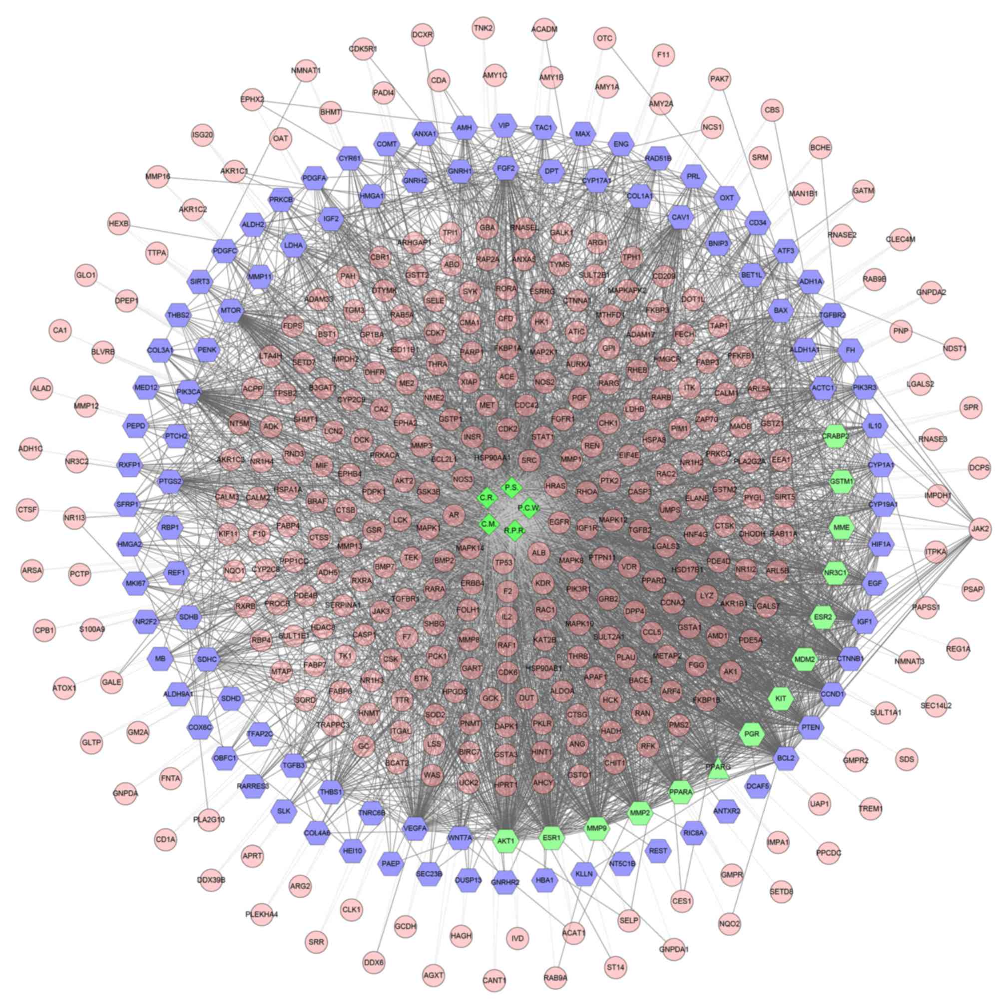 The following networks were constructed: A compound-compound target network of GFW; a herb-compound target-uterine fibroids target network of GFW; and a compound target-uterine fibroids target-other human proteins PPI network. The network analysis software Cytoscape (www.cytoscape.org; version 3.2.1) was used to construct networks. Cytoscape is a software that may be used to visualize biological pathways and intermolecular interaction networks, among others. Furthermore, it provides a basic set of features for data integration, analysis and visualization for complicated network analysis (30).