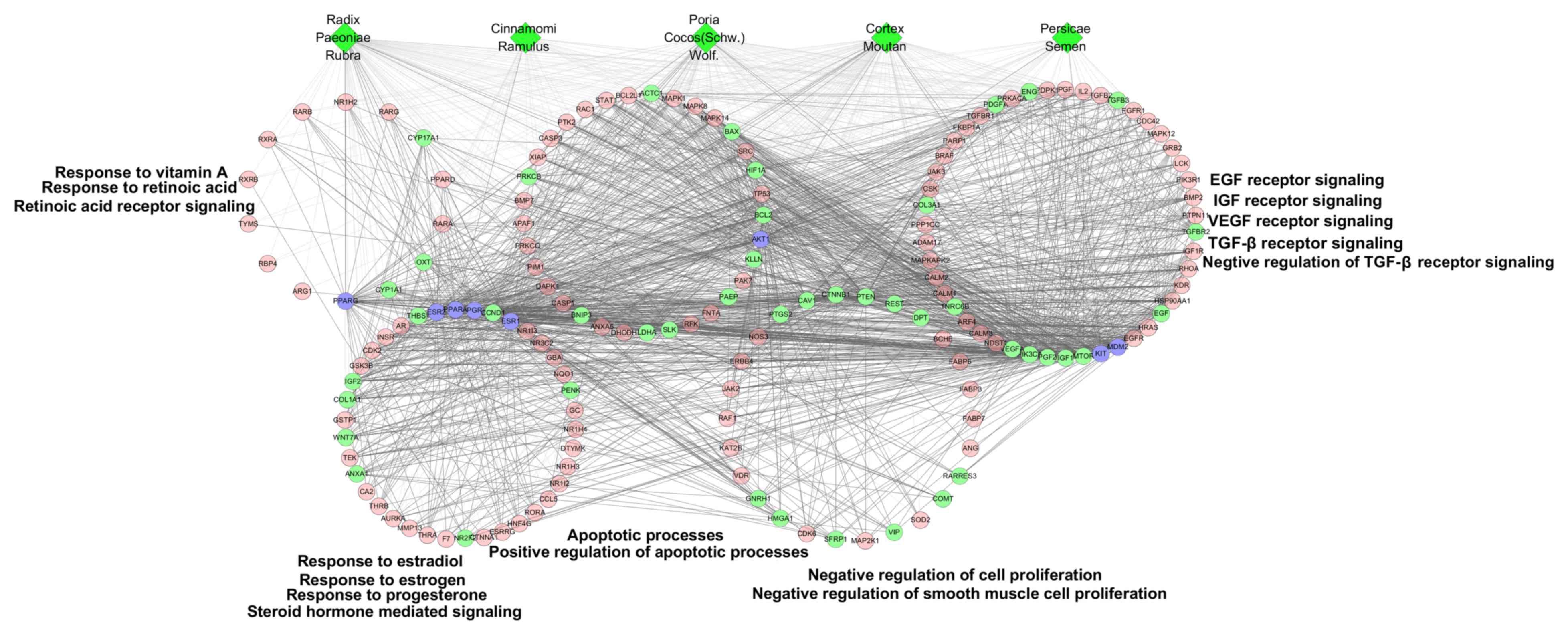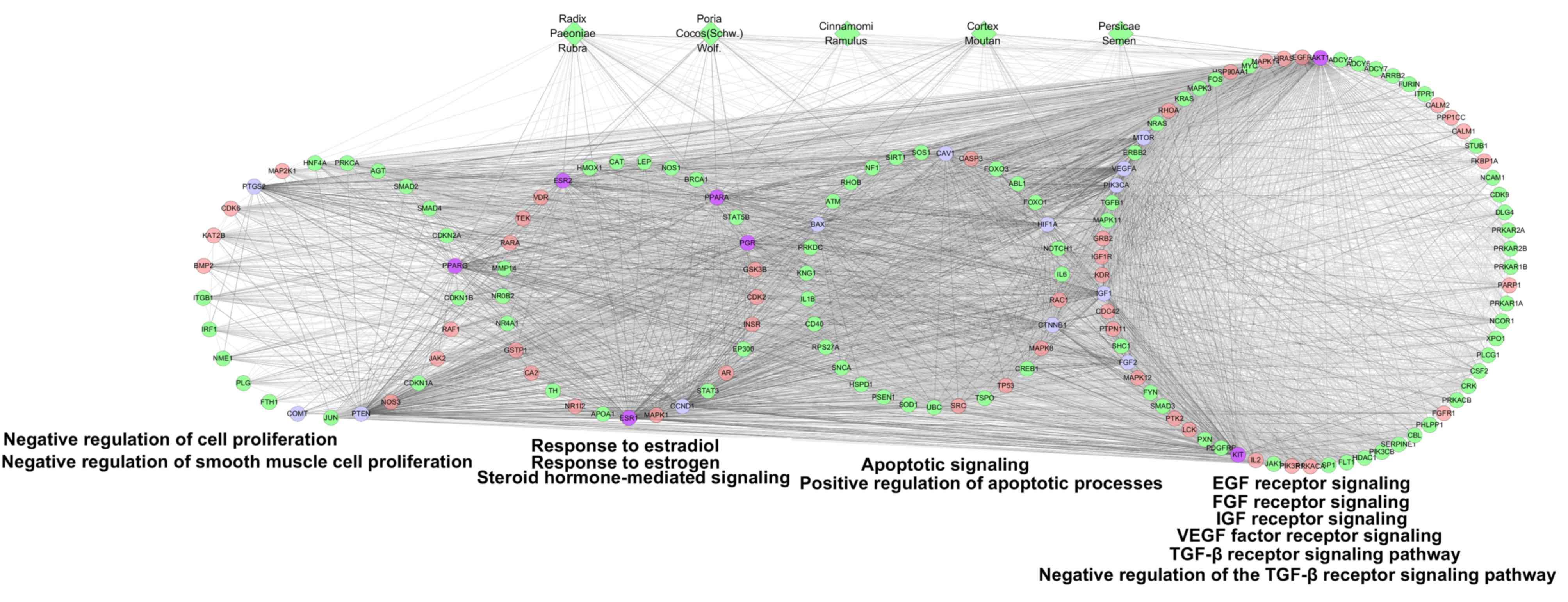 To understand the relationship between herbs of the GFW formula, compound targets and uterine fibroids targets, a herb-compound target-uterine fibroids target network was constructed. It was composed of 459 nodes (5 herbs, 362 compound targets, 78 uterine fibroids targets and 14 compound-uterine fibroids targets) and 3,736 edges (Fig. 2).