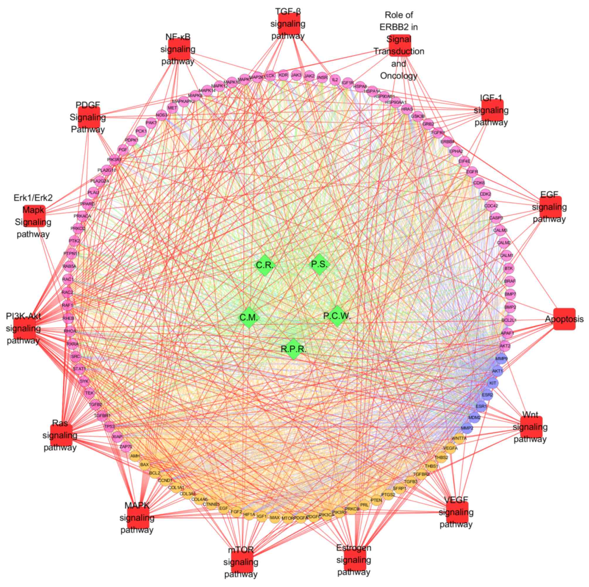 Pathway enrichment analysis of the major nodes indicated that the nodes were primarily related to the PI3K-Akt signaling pathway (fold enrichment=4.6; P<0.001), Ras signaling pathway (fold enrichment=5.1; P<0.001), MAPK signaling pathway (fold enrichment=3.8; P<0.001), estrogen signaling pathway (fold enrichment=8.5; P<0.001), ErbB signaling pathway (fold enrichment=9.0; P<0.001), VEGF signaling pathway (fold enrichment=10.7; P<0.001), mTOR signaling pathway (fold enrichment=2.8; P=0.0056), Wnt signaling pathway (fold enrichment=3.6; P<0.001), apoptosis (fold enrichment=4.9; P<0.001), EGF signaling pathway (fold enrichment=5.4; P<0.001), IGF-1 signaling pathway (fold enrichment=5.9; P<0.001), TGF-β signaling pathway (fold enrichment=3.9; P<0.001) and NF-κB signaling pathway (fold enrichment=4.0; P<0.001; Table IV and Fig. 7).