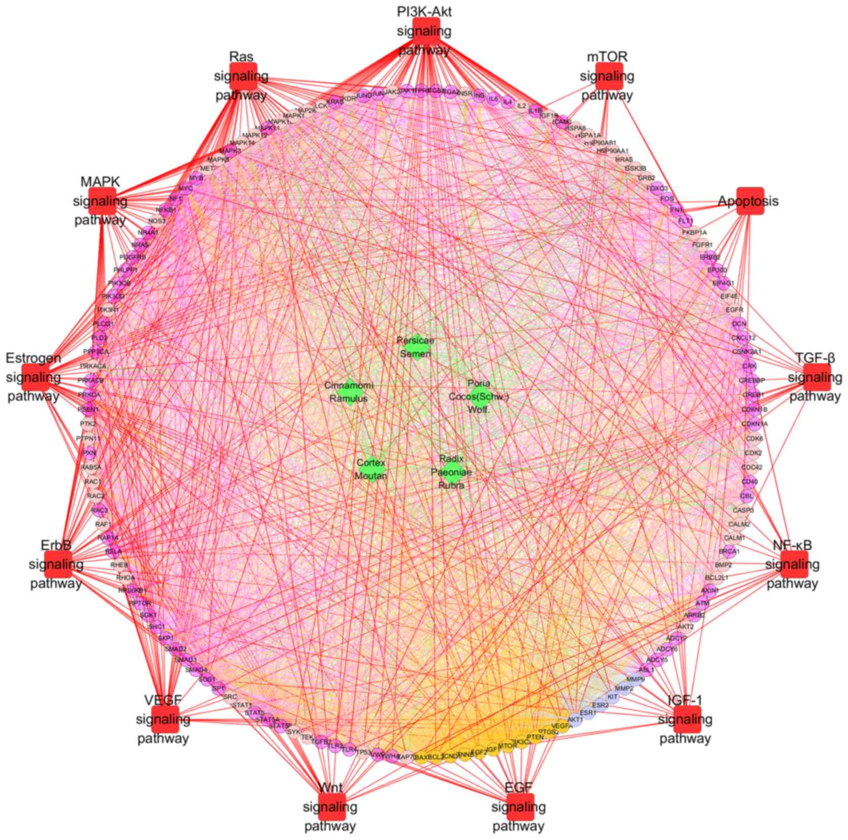 GFW was first described in Essential Prescriptions from the Golden Cabinet (Jingui Yaolue) (16). The traditional effects of the GFW formula are considered to be invigoration of the blood, prevention of blood stasis and reduction of masses. GFW is composed of Cinnamomi Ramulus (Gui Zhi), Poria Cocos (Schw.) Wolf. (Fuling), Cortex Moutan (Mu Dan Pi), Radix Paeoniae Rubra (Chi Shao) and Persicae Semen (Tao Ren) (16,17). A previous systematic review of 38 randomized controlled trials involving 3,816 participants demonstrated that compared with mifepristone alone, GFW or GFW plus mifepristone reduced the volume of fibroids and improved dysmenorrhea to a greater extent, and were considered to be safer (18). This suggests that GFW may be a potential alternative medicine for the treatment of uterine fibroids; however, its pharmacological mechanism is not well understood.