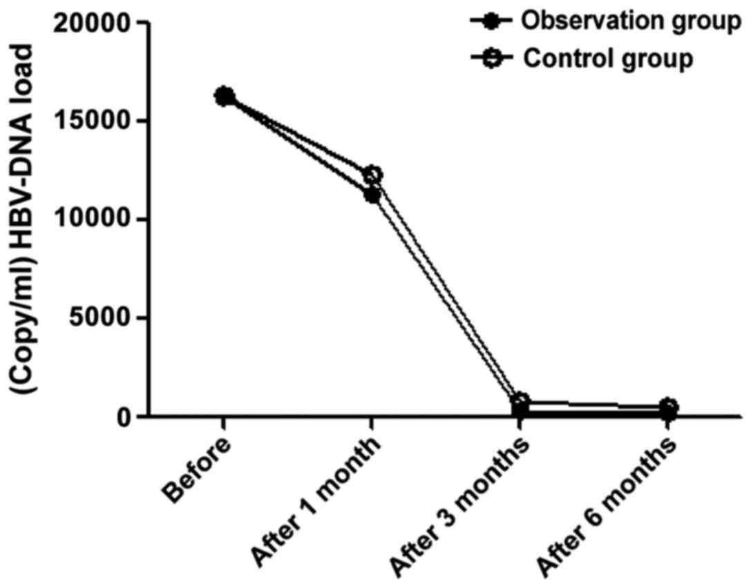 Table I.Comparison of HBV-DNA load at different time-points before and after intervention between the two groups (copy/ml). |