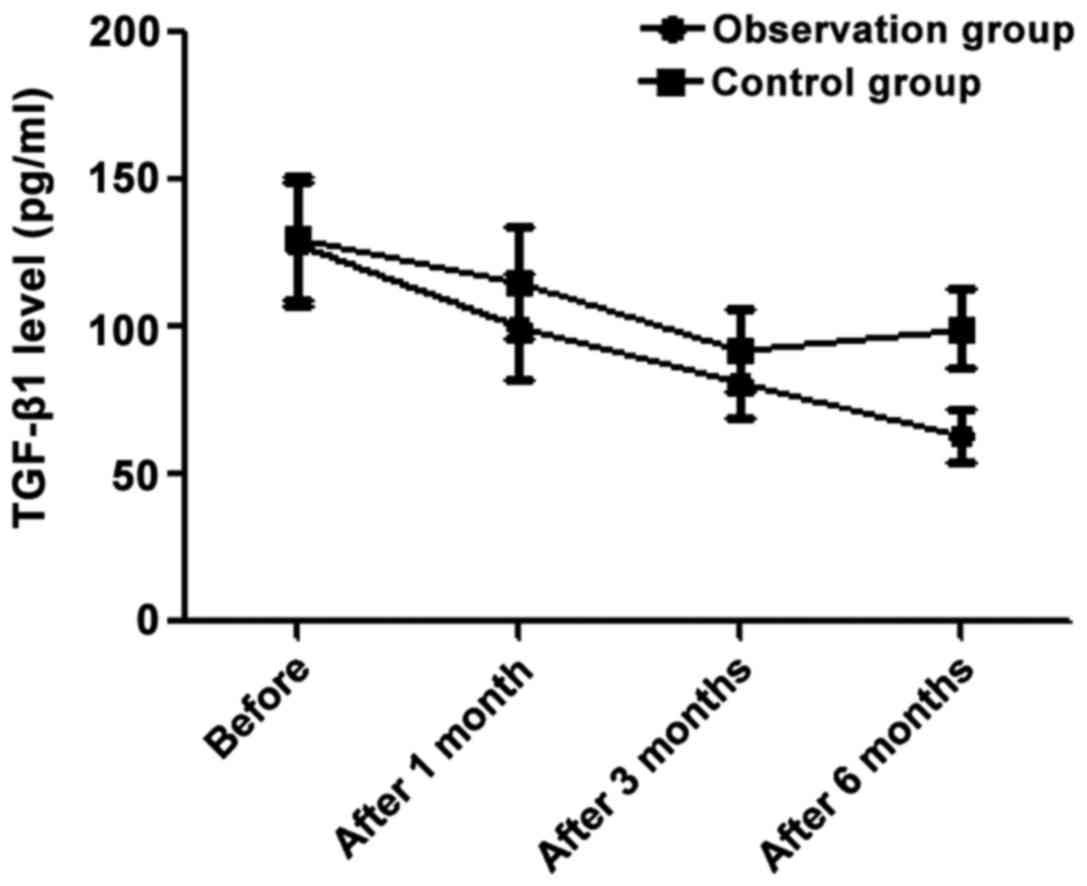 The results showed (Table II), that there was no statistically significant difference in comparison of TGF-β1 level between the two groups (P>0.05) before intervention. However, at 1, 3 and 6 months after intervention, we found that the TGF-β1 levels in the observation group were all lower than those in the control group in the same period (P<0.05). In the observation group, the TGF-β1 level at 6 months after intervention was the lowest, and sequentially followed by the levels at 3 months, at 1 month and before intervention (P<0.05) (Fig. 2).