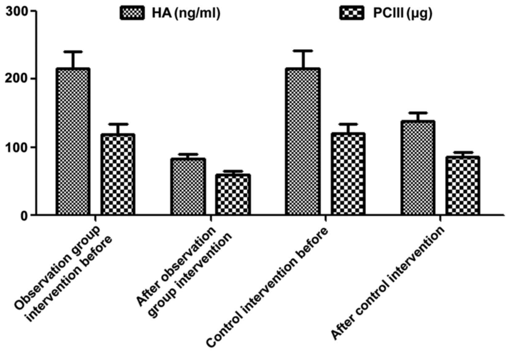 Before intervention, the level of HA in the observation group was 215.6±25.3 ng/ml, and the level of PCIII was 119.5±14.3 µg/l. After intervention, the HA level was 83.2±7.1 ng/ml, and the PCIII level was 60.3±5.1 µg/l. In addition, before intervention, the level of HA in the control group was 216.3±25.6 ng/ml, and the level of PCIII was 120.1±14.5 µg/l. After intervention, the HA level was 138.6±11.9 ng/ml, and the PCIII level was 86.6±6.8 µg/l. Furthermore, before intervention, there was no statistically significant difference in HA and PCIII between the two groups (P>0.05). However, after the intervention, the levels of HA and PCIII in the observation group were lower than those in the control group before and after intervention (P<0.05) (Fig. 3).