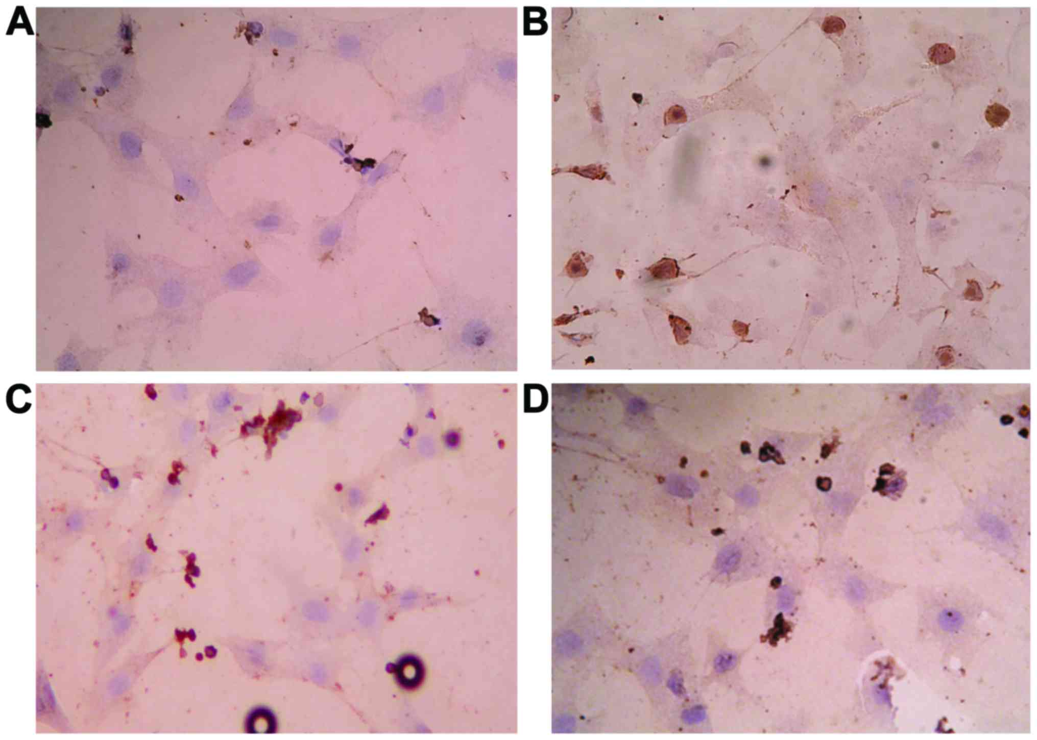 Results of immunocytochemical analysis showed that NF-κB was activated 24 h after LPS (1 µg/ml) stimulation, and nuclear staining was significantly increased (P<0.01). After treatment with GBE50 (80 µg/ml) and CAPE (20 µg/ml), almost no nuclear staining was observed (P<0.01) (Fig. 1).