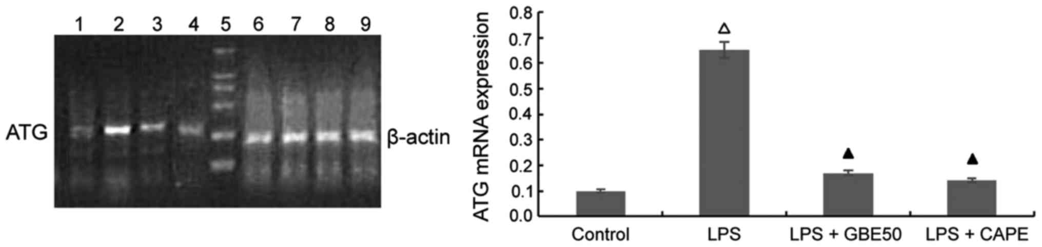Compared with control group (expression level of ATG mRNA was 0.652±0.227), expression level of ATG mRNA was significantly increased in NRVMs at 24 h after LPS (1 µg/ml) stimulation (expression level of ATG mRNA was 0.652±0.227, P<0.01). GBE50 (80 µg/ml) and CAPE (20 µg/ml) could inhibit the increased expression level of ATG mRNA induced by LPS (expression levels of ATG mRNA were 0.171±0.102 and 0.141±0.097, respectively, P<0.01). No significant differences in the expression level of ATG mRNA were found between LPS + GBE50 group, LPS + CAPE group and control group. Compared with LPS + GBE50 group, expression level of ATG mRNA was slightly reduced in LPS + CAPE group, but the difference was not significant (Fig. 3).