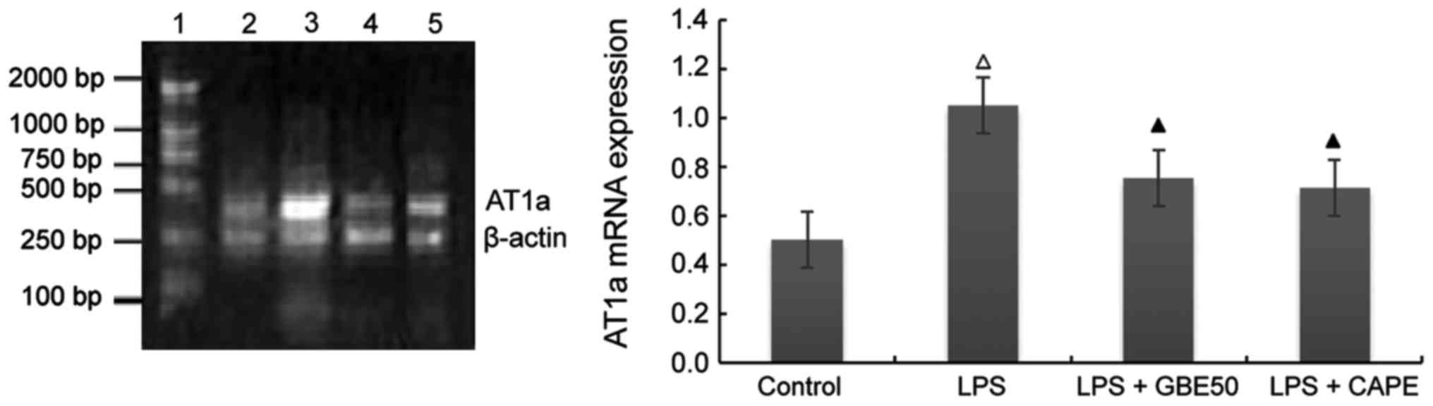 Compared with control group (expression level of AT1a receptor mRNA was 0.501±0.112), expression level of AT1a receptor mRNA in NRVMs were significantly increased at 24 h after LPS (1 µg/ml) stimulation (expression level of TLR4 mRNA was 1.05±0.227, P<0.01); compared with LPS group, GBE50 (80 µg/ml) and CAPE (20 µg/ml) significantly reduced the expression of AT1a mRNA in NRVMs induced by LPS (expression levels of AT1a receptor mRNA were 0.751±0.257 and 0.711±0.223, respectively, P<0.01). No significant difference in the expression level of AT1a receptor mRNA was found between LPS + GBE50 group, LPS + CAPE group and control group. Compared with LPS + GBE50 group, expression level of AT1a receptor mRNA was slightly reduced in LPS + CAPE group, but the difference was not significant (Fig. 4).