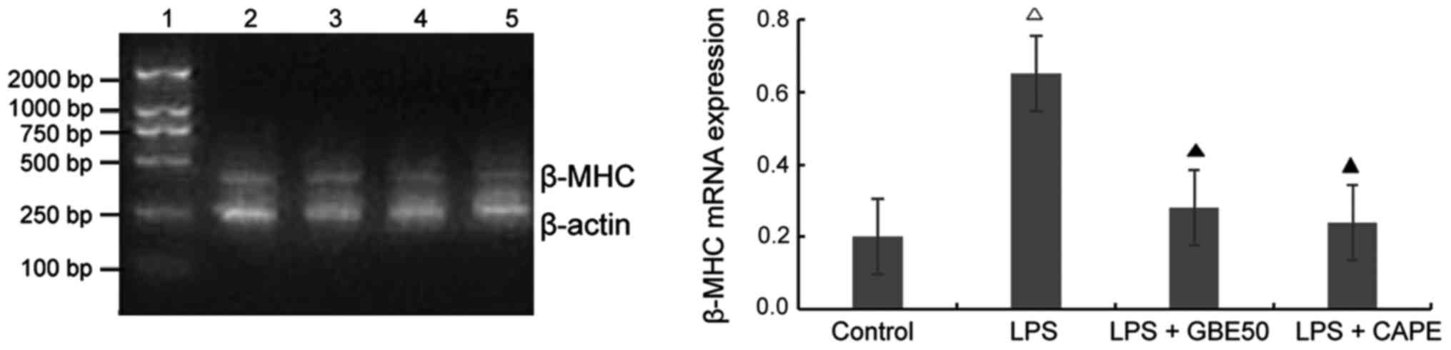 Compared with control group (expression level of β-MHC mRNA was 0.201±0.098), expression level of β-MHC mRNA in NRVMs were significantly increased at 24 h after LPS (1 µg/ml) stimulation (expression level of β-MHC mRNA was 0.653±0.228, P<0.01); compared with LPS group, GBE50 (80 µg/ml) and CAPE (20 µg/ml) significantly reduced the expression of β-MHC mRNA in NRVMs induced by LPS (expression levels of β-MHC mRNA were 0.201±0.098 and 0.191±0.089, respectively, P<0.01). No significant difference in the expression level of β-MHC mRNA was found between LPS + GBE50 group, LPS + CAPE group and control group. Compared with LPS + GBE50 group, expression level of β-MHC mRNA was slightly reduced in LPS + CAPE group, but the difference was not significant (Fig. 5).
