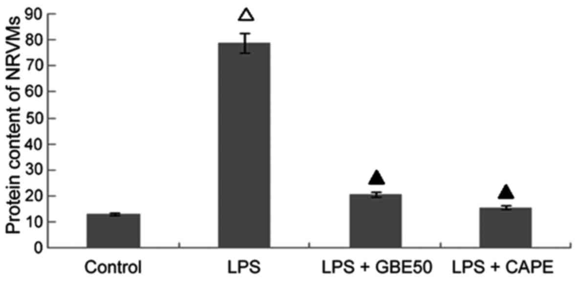 Compared with control group (protein content was 13.18±2.51 mg/l), protein content in NRVMs were significantly increased at 24 h after LPS (1 µg/ml) stimulation (protein content was 78.81±8.51 mg/l, P<0.01); compared with LPS group, GBE50 (80 µg/ml) and CAPE (20 µg/ml) significantly reduced the increased protein content in NRVMs induced by LPS (protein contents were 20.80±3.42 and 15.78±3.02 mg/l, respectively, P<0.01). No significant difference in protein content was found between LPS + GBE50 group, LPS + CAPE group and control group. Compared with LPS + GBE50 group, protein content was slightly reduced in LPS + CAPE group, but the difference was not significant (Fig. 6).
