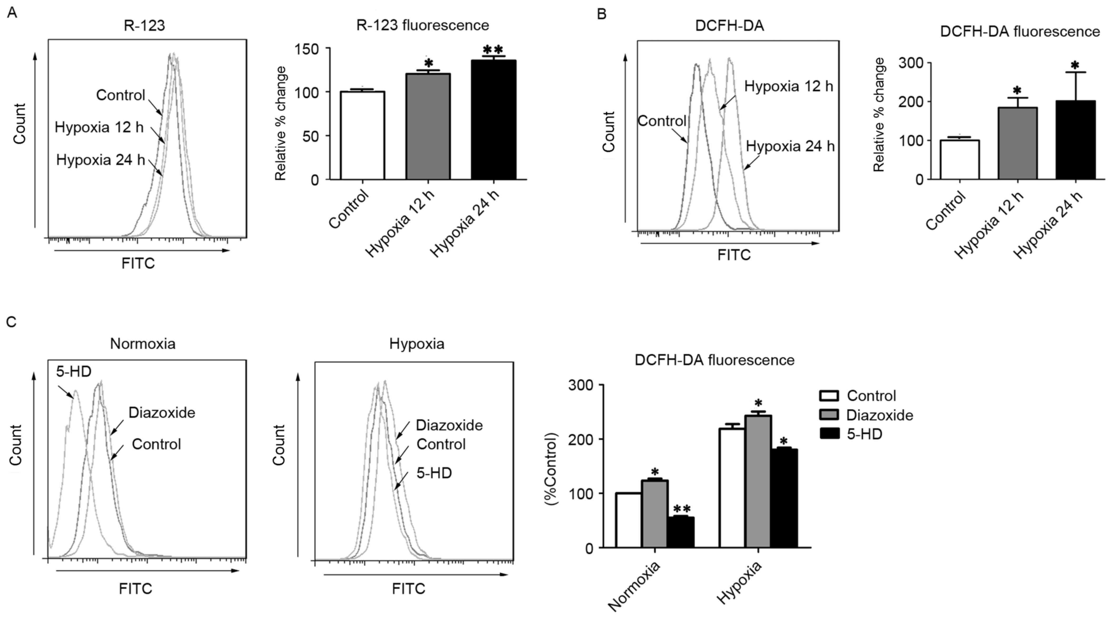 Hypoxia-triggered mitoKATP channel opening initiated by ATP depletion leads to the collapse of ΔΨm, which has been implicated in the generation of ROS (17). Consistent with a previous report (11), the present study observed that R-123 fluorescence intensity was significantly increased in hPASMCs subjected to hypoxia for 12 and 24 h (P<0.05 and P<0.01, respectively), relative to normoxic control cells (Fig. 1A), indicating that ΔΨm depolarization had occurred. Furthermore, hPASMCs exhibited significantly increased levels of ROS after 12 and 24 h of hypoxia (P<0.05), as determined by DCFH-DA staining (Fig. 1B). To further investigate whether mitoKATP channels were associated with ROS production in hPASMCs, the levels of intracellular ROS were measured following treatment with diazoxide or 5-HD, to activate or inhibit mitoKATP, respectively. As predicted, opening of mitoKATP significantly increased the level of intracellular ROS, and closure of mitoKATP significantly decreased the level of intracellular ROS under hypoxic conditions (P<0.05; Fig. 1C). Furthermore, under normoxic conditions, the opening of mitoKATP significantly increased the level of intracellular ROS while closure of mitoKATP significantly decreased the level of intracellular ROS (P<0.05; Fig. 1C). These results suggest that mitoKATP channels may be involved in the generation of ROS in hPASMCs under hypoxic conditions, potentially through the collapse of ΔΨm.