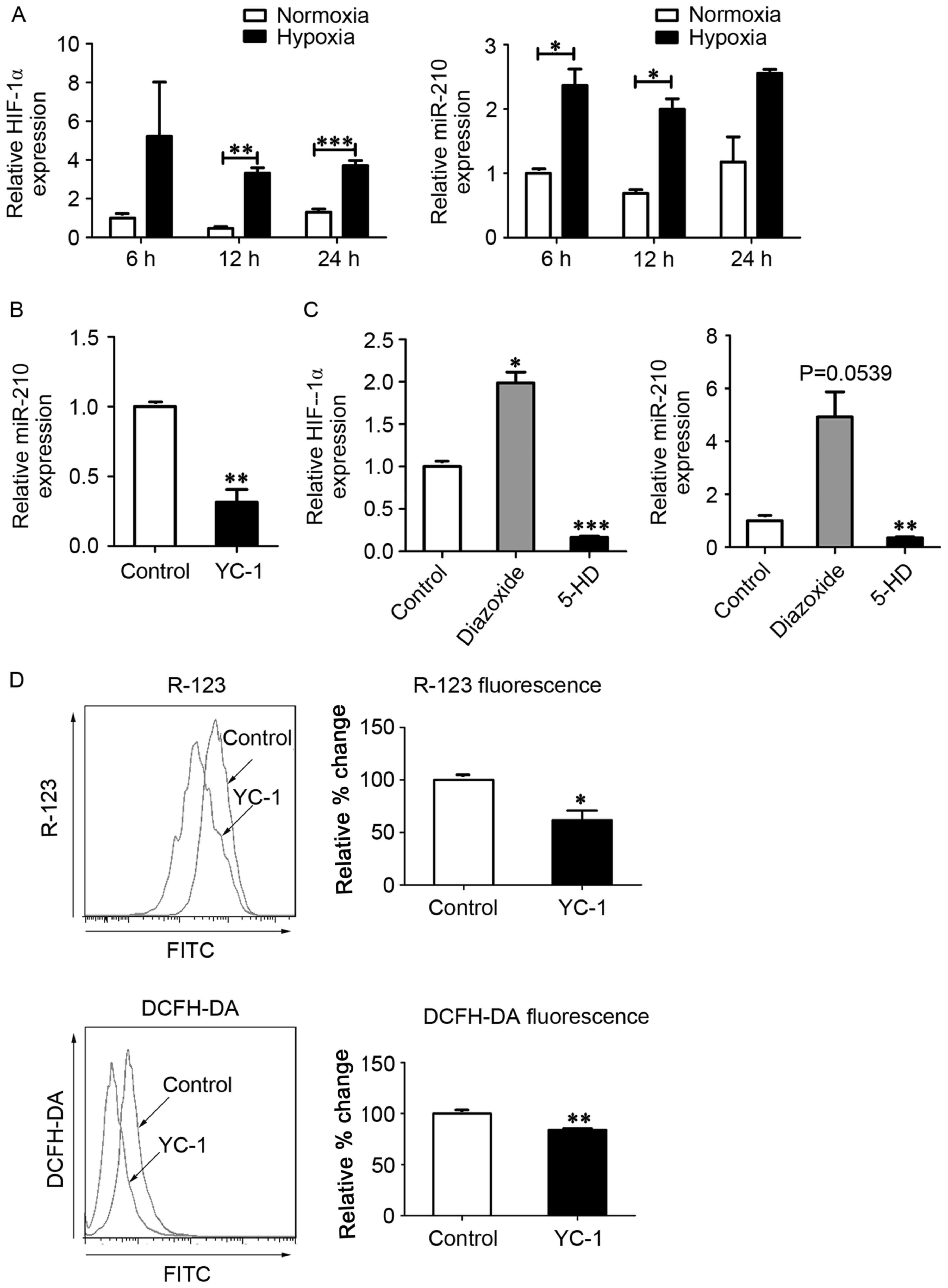 As HIF-1α is a critical oxygen sensor and master transcriptional regulator of the hypoxic adaptive response, it has been suggested that mitoKATP channels function in combination with HIF-1α and its downstream targets, including miR-210 and ISCU (12,18). To investigate whether mitoKATP was associated with the expression of HIF-1α and miR-210 in hPASMCs during hypoxia, the expression of HIF-1α mRNA and miR-210 was measured using RT-qPCR. In hPASMCs subjected to hypoxia, levels of HIF-1α mRNA were significantly increased at 12 and 24 h (P<0.01 and P<0.001, respectively), and miR-210 levels were significantly increased at 6 and 12 h (P<0.05; Fig. 2A). In turn, expression of miR-210 was significantly decreased following treatment with the HIF-1α inhibitor YC-1 (P<0.01; Fig. 2B), and expression of HIF-1α was significantly increased following treatment with the mitoKATP agonist diazoxide (P<0.05; Fig. 2C). Furthermore, the levels of HIF-1α mRNA and miR-210 were significantly decreased following closure of mitoKATP with 5-HD (P<0.001 and P<0.01, respectively; Fig. 2C). To further investigate whether HIF-1α was involved in the regulation of mitoKATP, ΔΨm and ROS levels were measured in hPASMCs treated with YC-1. Significant decreases in the fluorescence intensity of R-123 (P<0.05) and DCFH-DA (P<0.01) were observed in hPASMCs upon inhibition of HIF-1α (Fig. 2D).