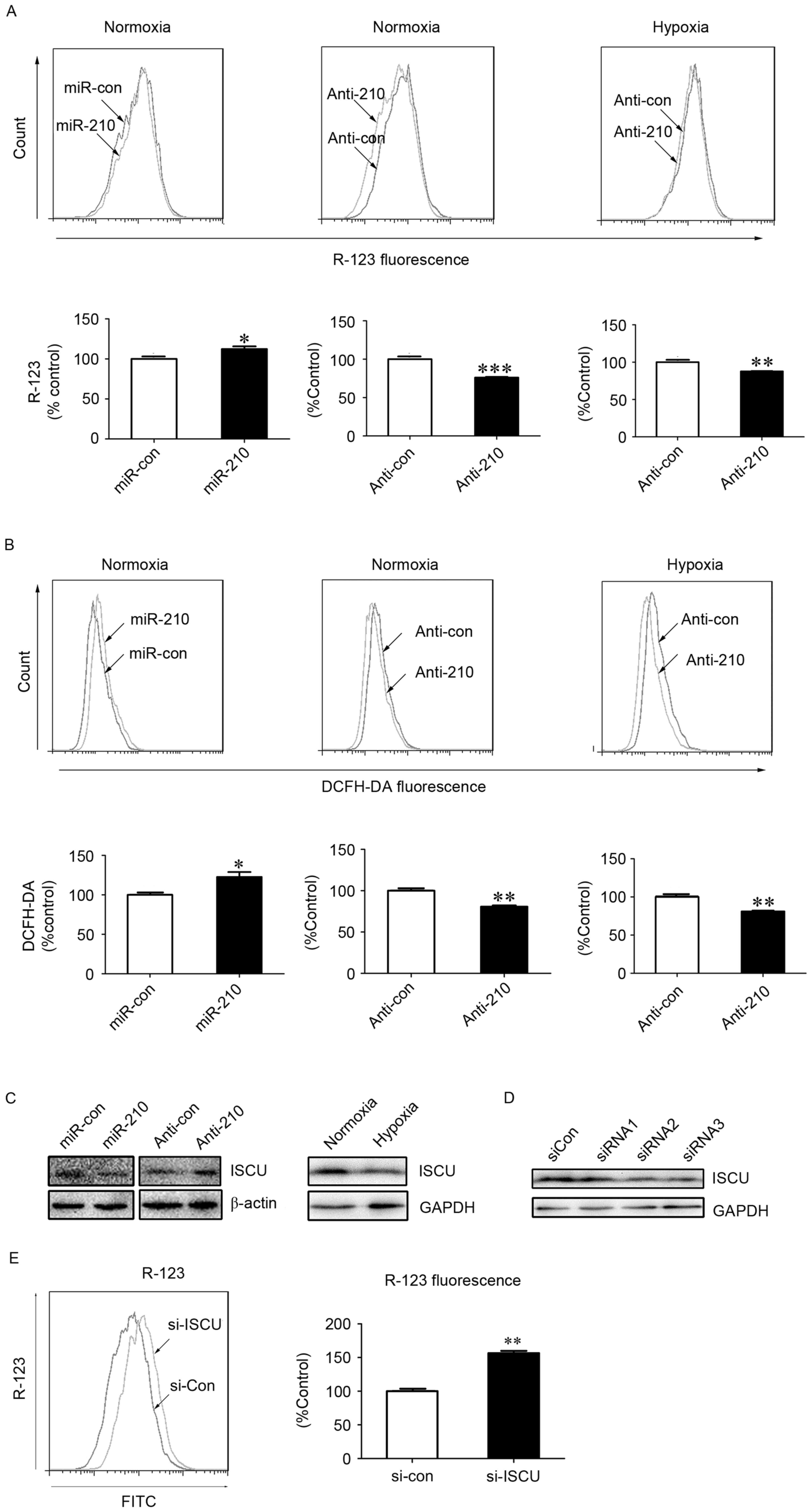Previous studies have indicated that ISCU is a downstream regulatory target of miR-210 (19,20). ISCU, as an essential component of respiratory electron transfer complexes, is involved in ROS generation in the mitochondria (21). The present study blocked the expression of miR-210 using an inhibitor of miR-210. Under normoxic and hypoxic conditions, significant decreases in the fluorescence intensity of R-123 (P<0.001 and P<0.01, respectively) and DCFH-DA (P<0.01) were observed in hPASMCs upon treatment with miR-210 inhibitor transfection (Fig. 3A and B), indicating an involvement of miR-210 in the alteration of ΔΨm and generation of ROS. The expression of ISCU was subsequently assessed, and was demonstrated to be reduced or increased following treatment with miR-210 mimic or miR-210 inhibitor under normoxic conditions, respectively (Fig. 3C). As shown in Fig. 3C, ISCU expression was reduced under hypoxic conditions compared with normoxic conditions.