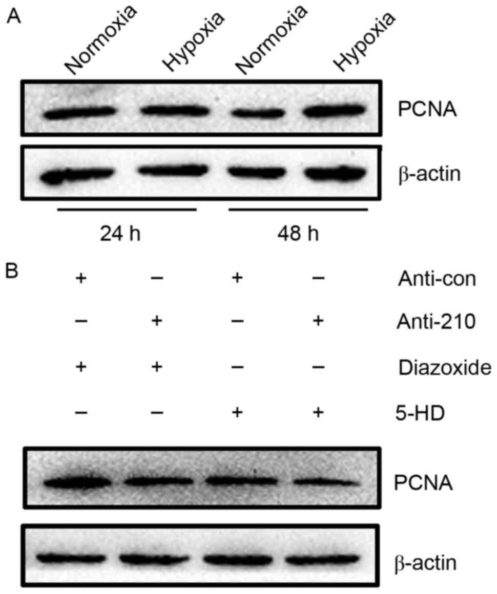As hPASMCs grow relatively slowly, the proliferation of hPASMCs was evaluated by measuring the expression of PCNA, as an established marker of cell proliferation that is synthesized in the early G1 and S phases of the cell cycle (22). Results of western blot analysis showed that PCNA expression was markedly increased in hPASMCs subjected to hypoxia for 48 h, relative to normoxic controls (Fig. 4A). The proliferation of hPASMCs upon activation or inhibition of mitoKATP and inhibition of miR-210 was subsequently assessed. It was observed that activation of mitoKATP increased the expression of PCNA, while inhibition of mitoKATP and miR-210 decreased PCNA expression (Fig. 4B). These results indicate that mitoKATP promotes the proliferation of hPASMCs under hypoxic conditions through the miR-210 signaling pathway.