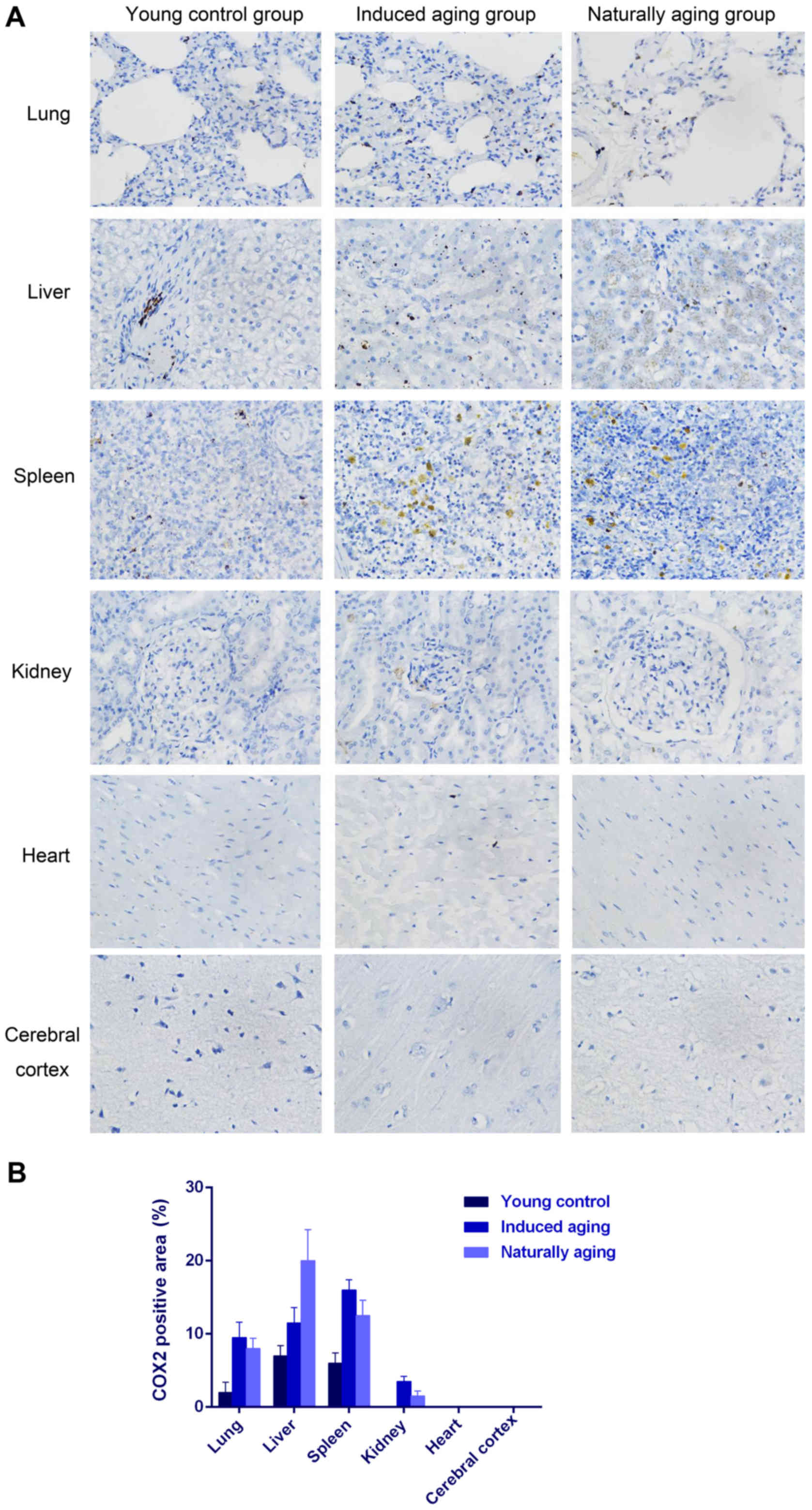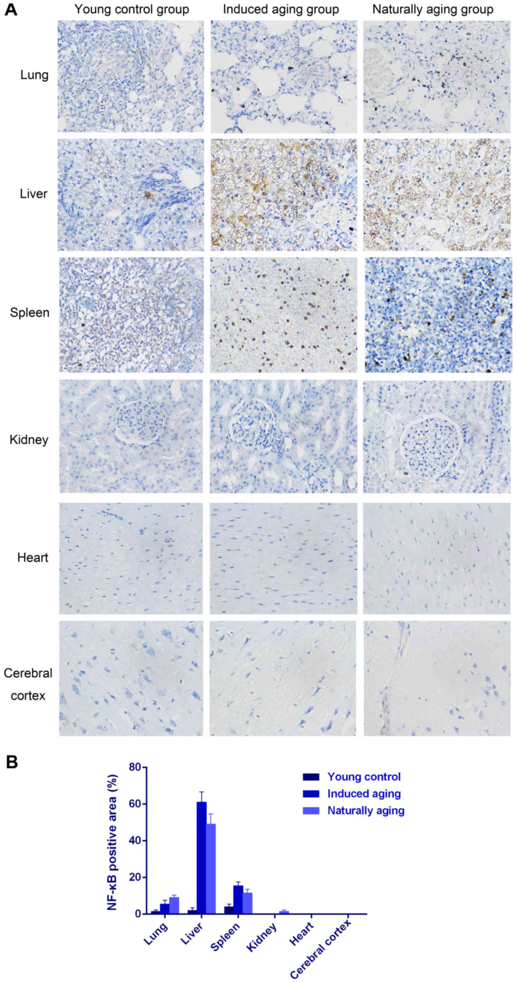 To determine histologic expressions and histopathological features in the induced aging model, H&E staining was used for tissue morphology in liver, kidney, heart, lung and spleen and brain tissue, and nissl staining was used for morphology and pathology of neural tissue, and immunohistochemical staining was used to evaluate the expression of PCNA, p16 and p21. H&E staining and nissl staining revealed that induced aging group and naturally aging group have parallel histopathological features in liver, kidney, heart, lung and spleen and brain: i) in H&E stained section from lung tissue, lung injury such as inflammatory cell infiltration and alveolar wall destruction was observed in both induced aging group and naturally aging group, compared to the normal lung architecture in young control group (Fig. 2A); ii) in H&E stained section from liver tissue, microabscess involving a few hepatocytes with inflammatory cells and necrotic debris was accumulated in the liver tissue in induced aging group and naturally aging group (Fig. 2B); iii) in H&E stained section from spleen tissue, we observed high degree of morphologic organization in the young control group, while density of inflammatory cells was diminished in both induced aging group and naturally aging group (Fig. 2C); iv) in H&E stained section from kidney tissue, young control group exhibited normal histology, and induced aging and naturally aging group revealed enlarged vascular glomeruli, widening the glomerular capsular space and destructed flat epithelium lining of Bowman's capsule (Fig. 2D); v) in H&E stained section from heart tissue, disordered arrangement and enlarged size of cardiomyocytes was observed, indicating a cardiac remodeling event in both aging groups (Fig. 2E); and vi) in sections from brain tissue, H&E stained cerebral cortex sections from both aging groups revealed high level of inflammatory cell in comparison to young control group, which indicate that inflammation was progressing in the cerebral cortex. In H&E stained section of hippocampus AC area, young control group showed well organized pyramidal cells, and different types of the neuralgia cells are scattered inside the neuropil matrix, while both aging groups showed apparent decrease in the number of pyramidal cells with presence of some shrunken degenerated cells. Similar results were also observed in nissl staining sections (Fig. 3). Immunohistochemical staining indicated increased levels of NF-Κb, iNOS and COX2 in lung, liver and spleen of both aging groups in comparison to young control group (Figs. 4–6). P<0.05, significantly different from the control groups.