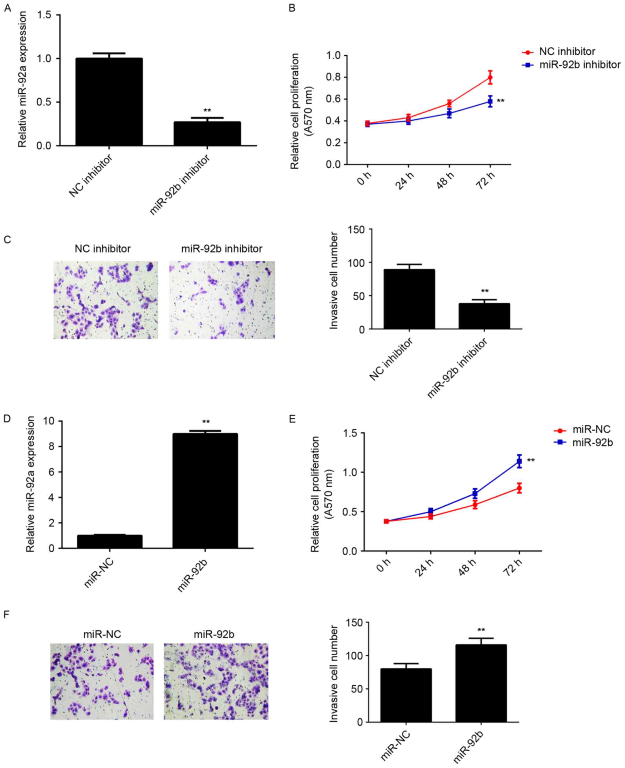 The regulatory role of miR-92b in osteosarcoma in vitro was determined using U2OS cells, as miR-92b expression was highest in U2OS cells compared with the other osteosarcoma cell lines. miR-92b expression was upregulated in U2OS cells, thus they were transfected with either miR-92b inhibitor or NC inhibitor. Transfection with miR-92b inhibitor significantly decreased miR-92b expression compared with the NC inhibitor group (P<0.01; Fig. 2A). MTT and Transwell assays were further conducted to examine cell proliferation and invasion, respectively. miR-92b knockdown significantly decreased U2OS cell proliferation and invasion compared with the NC inhibitor group (P<0.01; Fig. 2B and C). This suggests that miR-92b may promote the proliferation and invasion of osteosarcoma cells. To further confirm these results, U2OS cells were transfected with miR-92b mimic or miR-NC. Transfection with miR-92b mimic significantly upregulated miR-92b levels compared with miR-NC transfection (P<0.01; Fig. 2D). Overexpression of miR-92b significantly increased the proliferation and invasion of U2OS cells (P<0.01; Fig. 2E and F), indicating that miR-92b promotes the proliferation and invasion of osteosarcoma cells.