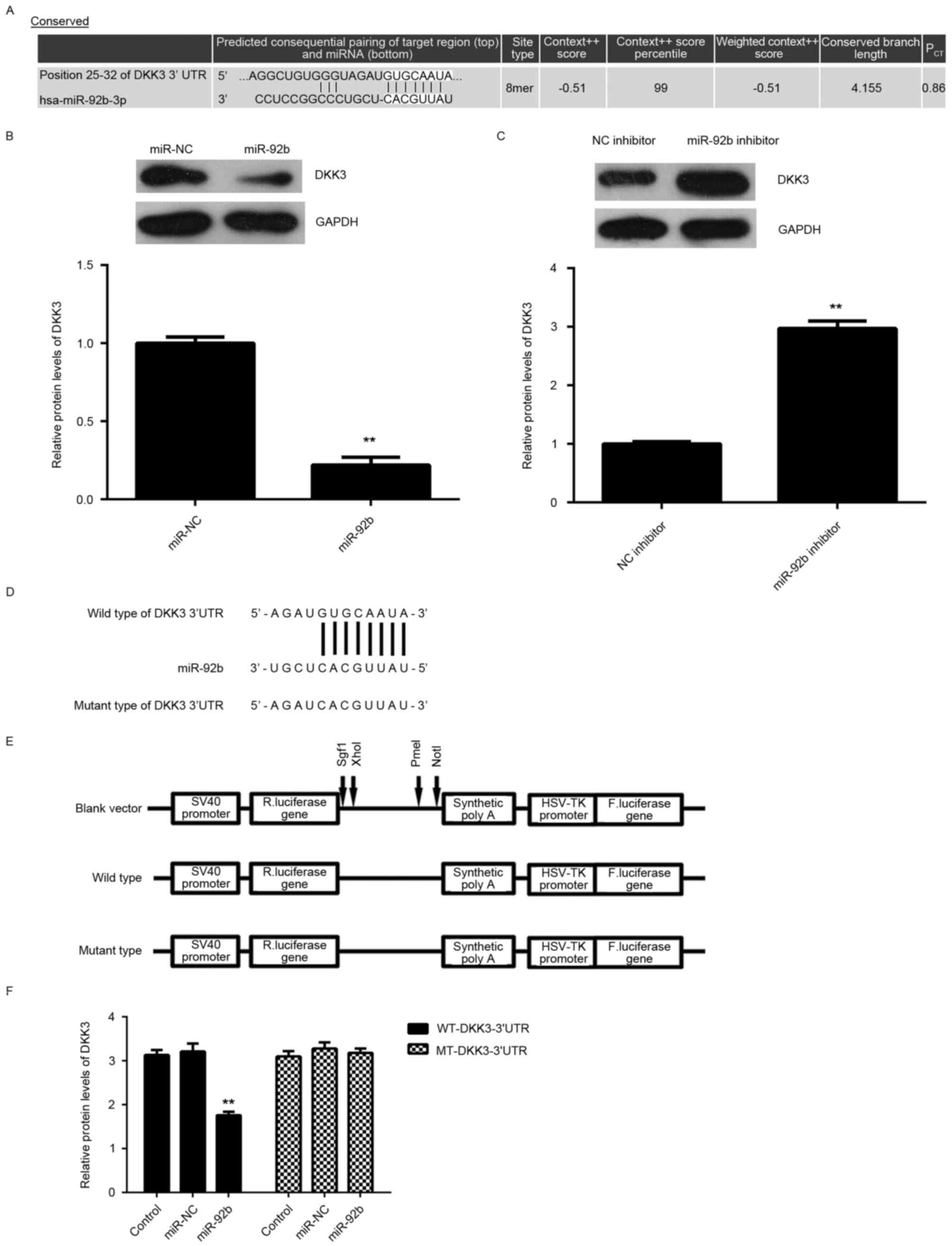 Total RNA was extracted using TRIzol® Reagent (Thermo Fisher Scientific, Inc.) according to the manufacturer's instructions. To detect miR expression, RT-qPCR was performed using the All-in-One™ miRNA qRT-PCR Detection kit (GeneCopoeia, Inc., Rockville, MD, USA) and an ABI 7500 thermocycler (Applied Biosystems; Thermo Fisher Scientific, Inc.) according to the manufacturer's instructions. The thermocycling conditions were as follows: 95°C for 10 min, and 45 cycles of denaturation at 95°C for 15 sec and annealing/elongation at 60°C for 15 sec. The U6 gene was used as an internal control. The primers for miR-92b (cat. no. HmiRQP0834) and U6 (cat. no. HmiRQP9001) were purchased from Guangzhou Fulengen Co., Ltd. (Guangzhou, China). To detect mRNA expression, total RNA was converted to cDNA using the PrimeScript 1st Strand cDNA Synthesis kit (Takara Bio, Inc., Tokyo, Japan) according to the manufacturer's instructions. A SYBR Green I Real-Time PCR kit (Biomics Biotechnologies, Co., Ltd., Nantong, China) was then used to perform qPCR according to the manufacturer's instructions. GAPDH was used as the internal reference for mRNA. The primers used were as follows: DKK3, forward, 5′-AGGACACGCAGCACAAATTG-3′ and reverse, 5′-CCAGTCTGGTTGTTGGTTATCTT-3′; GAPDH, forward, 5′-ACAACTTTGGTATCGTGGAAGG-3′ and reverse; 5′-GCCATCACGCCACAGTTTC-3′. The thermocycling conditions were 95°C for 3 min, followed by 40 cycles of 95°C for 15 sec and 60°C for 15 sec. Relative expression was analyzed using the 2−ΔΔCq method (20).