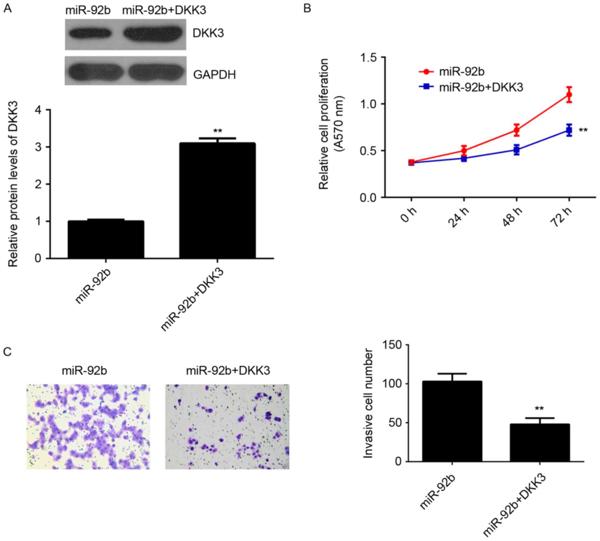 It was speculated that DKK3 may be involved in the miR-92b-induced proliferation and invasion of U2OS cells. To clarify this, miR-92b-overexpressing osteosarcoma cells were transfected with pcDNA3.1-DKK3 expression plasmid to restore DKK3 expression. Following transfection, DKK3 expression was significantly higher in the miR-92b+DKK3 group compared with the miR-92b group (P<0.01; Fig. 4A). MTT and Transwell assays indicated that the proliferation and invasion of U2OS cells was significantly decreased in the miR-92b+DKK3 group compared with the miR-92b group (P<0.01; Fig. 4B and C). This suggests that restoration of DKK3 expression reverses the increased proliferation and invasion of osteosarcoma cells induced by miR-92b overexpression, suggesting that miR-92b stimulates the proliferation and invasion of osteosarcoma cells, at least partly, by targeting DKK3.