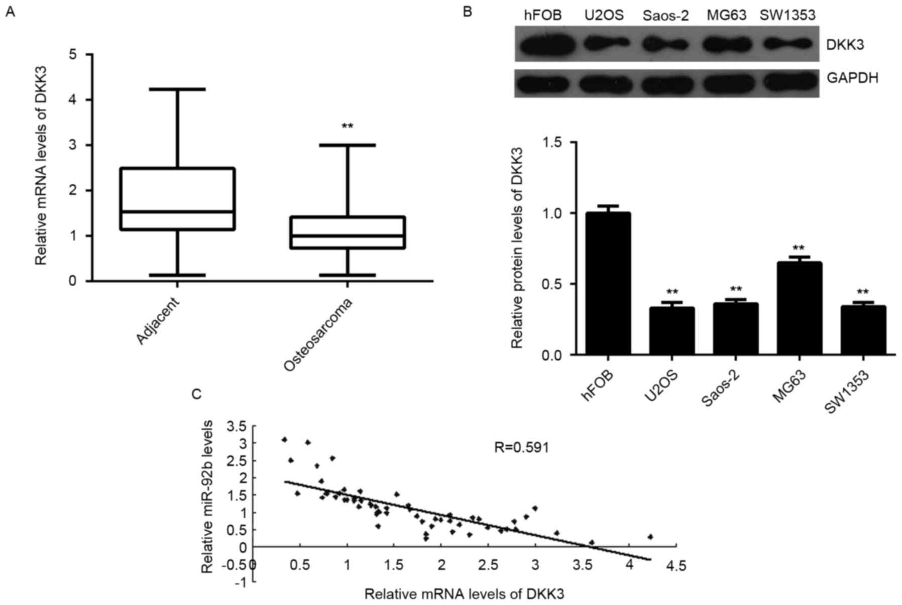 Taken together, the results of the current study demonstrate that miR-92b expression is upregulated in osteosarcoma and promotes the proliferation and invasion of osteosarcoma cells by directly targeting DKK3. This suggests that miR-92b may be a potential target for the treatment of osteosarcoma.