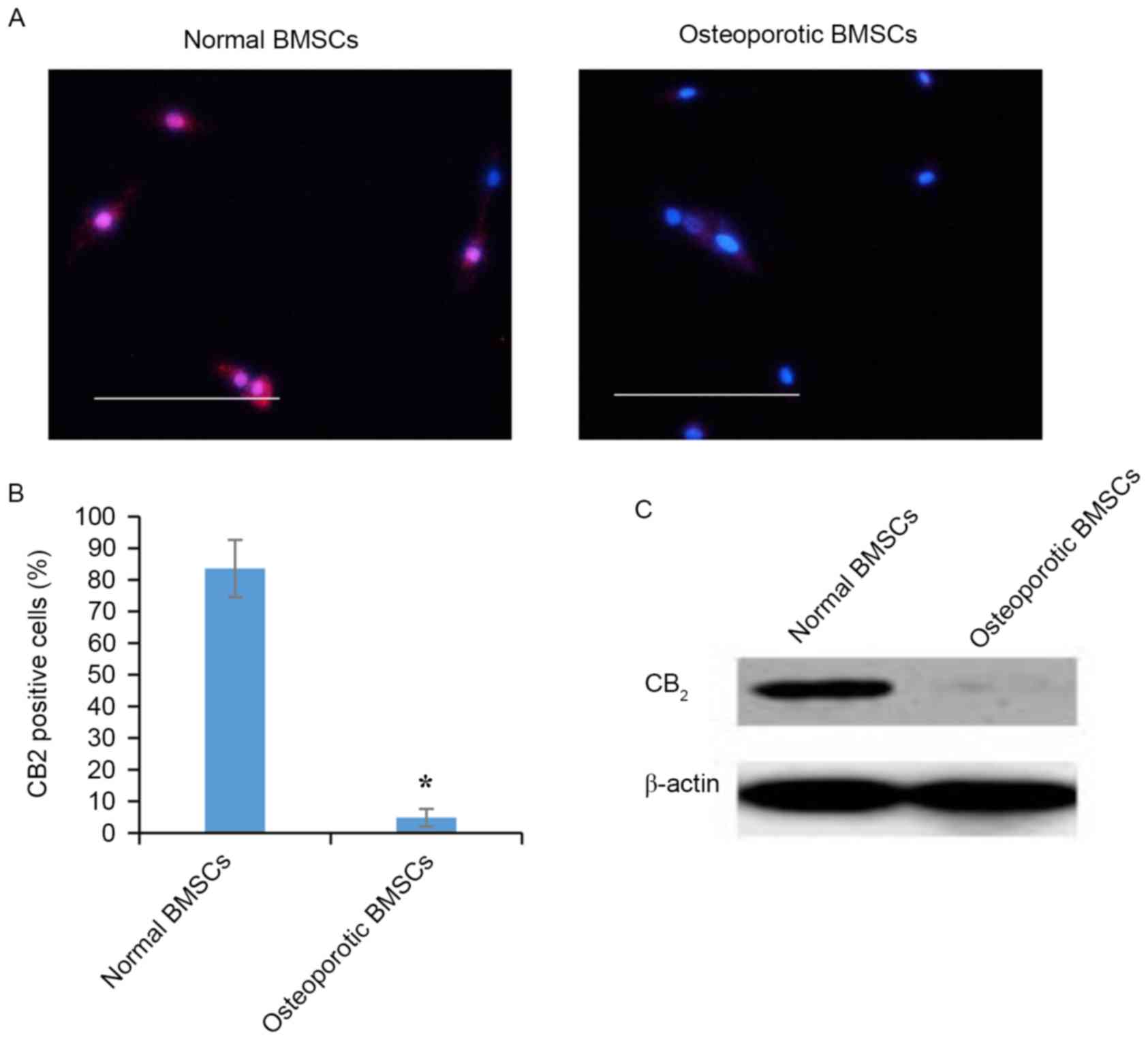 Previous studies have revealed the loss of CNR2s expression in the bone marrow of osteoporotic patients. However, MSC-specific expression patterns of CNR2 in bone marrow has remained to be fully elucidated. The present study assessed the expression of CNR2 in cultured BMSCs isolated from healthy individuals and osteoporotic patients. Immunofluorescent staining showed that CNR2 was only expressed in normal BMSCs but absent in osteoporotic BMSCs (Fig. 2A). Quantification of immunofluorescent images indicated that CNR2-expressing cells accounted for >80% of the overall BMSC population in healthy individuals but <5% in osteoporotic BMSCs (Fig. 2B). Western blot analysis also demonstrated significantly lower protein levels of CNR2 in BMSCs from osteoporotic patients compared to in BMSCs from healthy individuals (Fig. 2C).