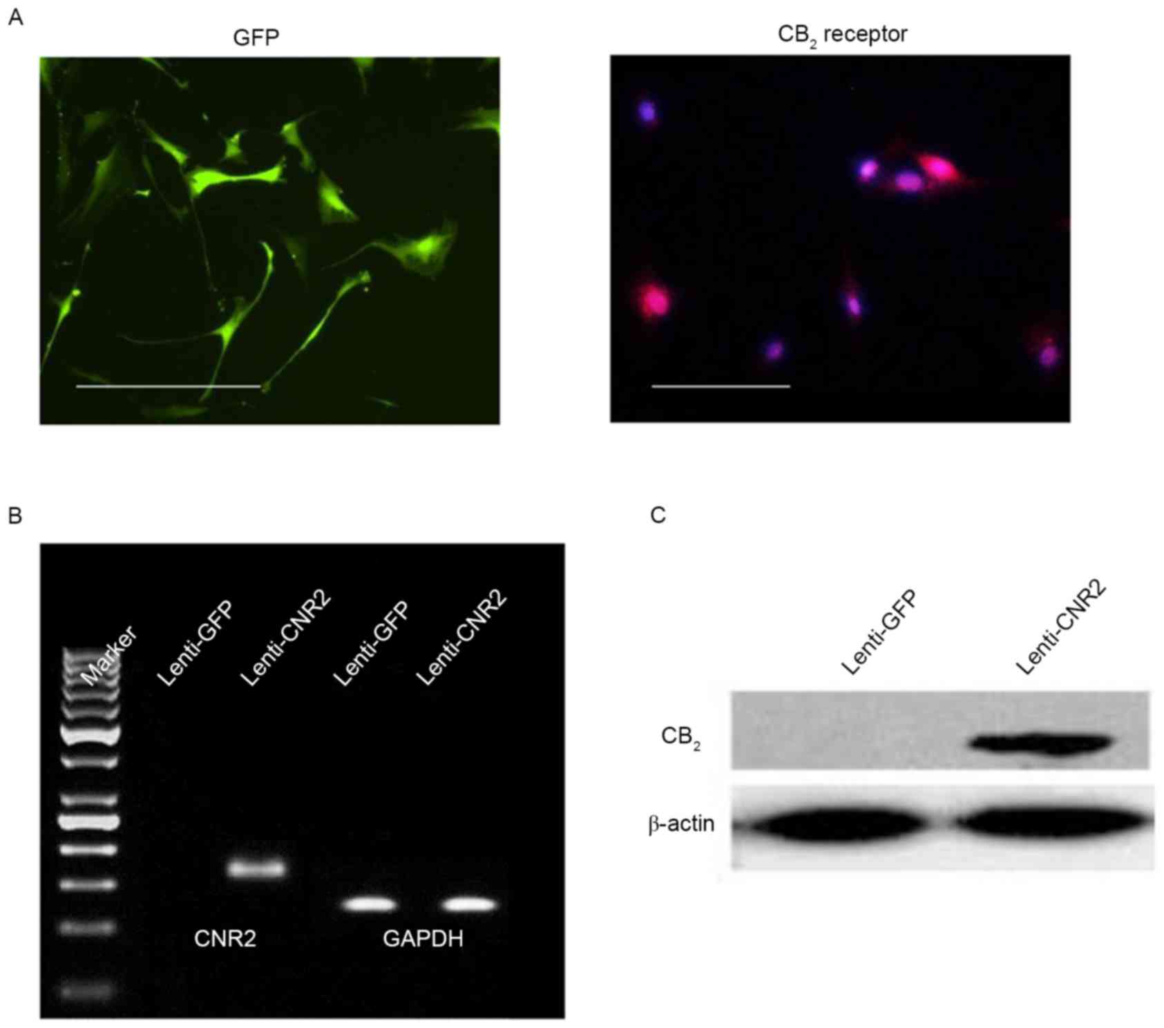 Cloning of CNR2 and lentiviral vectors were prepared by Hanbio Biotechnology (Shanghai, China) to overexpress CNR2 in target cells. In brief, the cDNA of CNR2 was amplified with specific primers from a cDNA library and sub-cloned into a T vector. The coding sequence of CNR2 was then cloned into lentiviral vectors (pLVX-IRES-ZsGreen1) that expressed GFP and puromycin-resistant proteins for screening. Lentiviral supernatants (Lenti-CNR2) were packaged by triple transfection of HEK293T cells (Fig. 1). MSCs were infected by adding virus-containing supernatants to the culture medium. Transduced cells were selected by addition of puromycin (1 µg/ml) at 2 days after infection for 1 week. Transduction was verified by visual examination for cells expressing green fluorescent protein (GFP) under a fluorescent microscope. Cells infected with lentivirus containing empty vectors (Lenti-GFP) were used as controls.