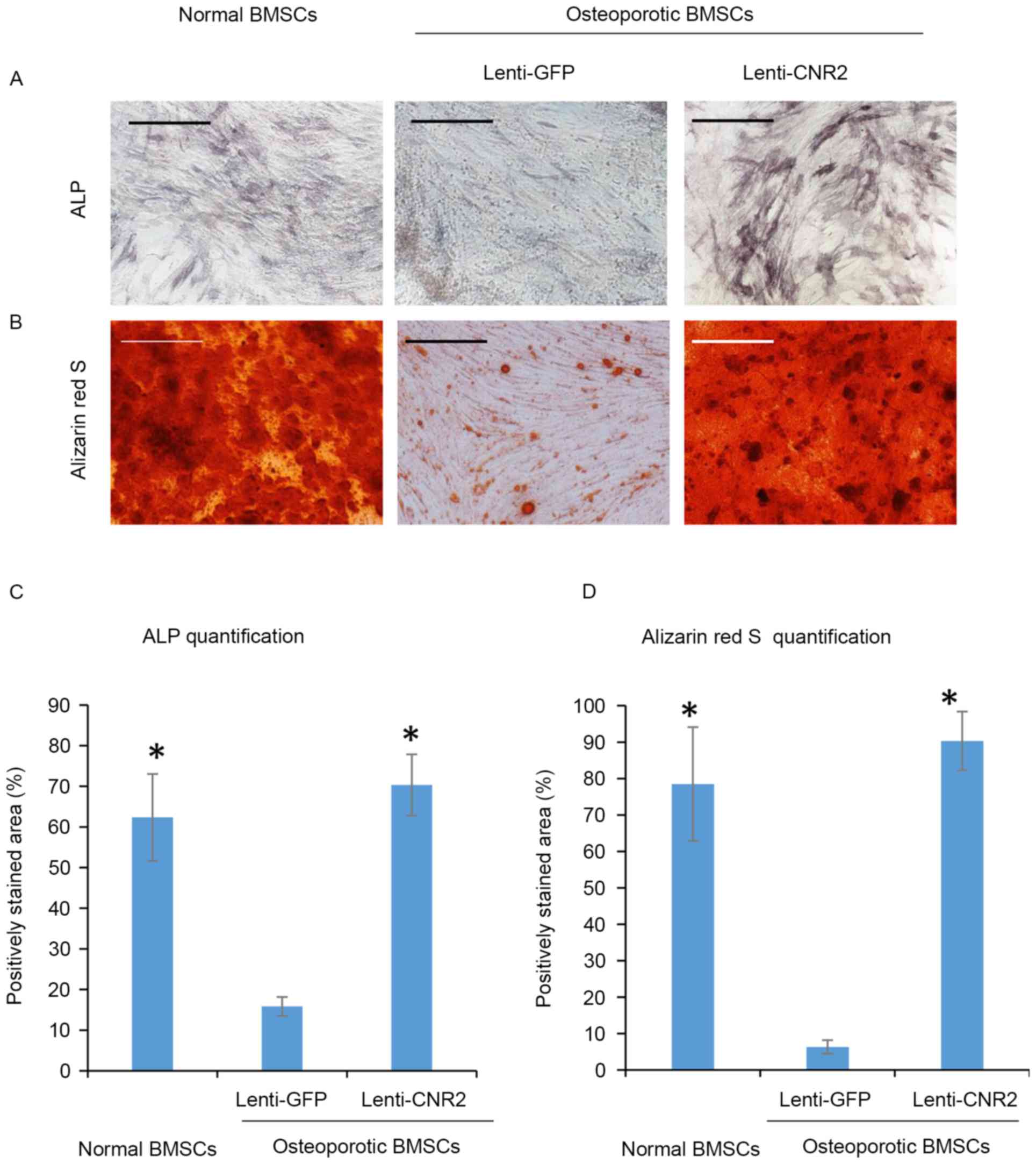 Previous studies have revealed the loss of CNR2 expression in the bone marrow of osteoporotic patients (9). The present study hypothesized that lentiviral vector-mediated overexpression of CNR2 reverses the osteogenic differentiation and mineralization ability of BMSCs isolated from osteoporotic patients. To test this hypothesis, patient-derived BMSCs were transfected with CNR2-expressing lentiviral vector, and their osteogenic differentiation ability and associated cell signaling were tested. Regulation of CNR2 in osteoporosis patient-derived BMSCs may provide a promising therapeutic strategy, which transforms local stem cells from a disease state to a reparative state.