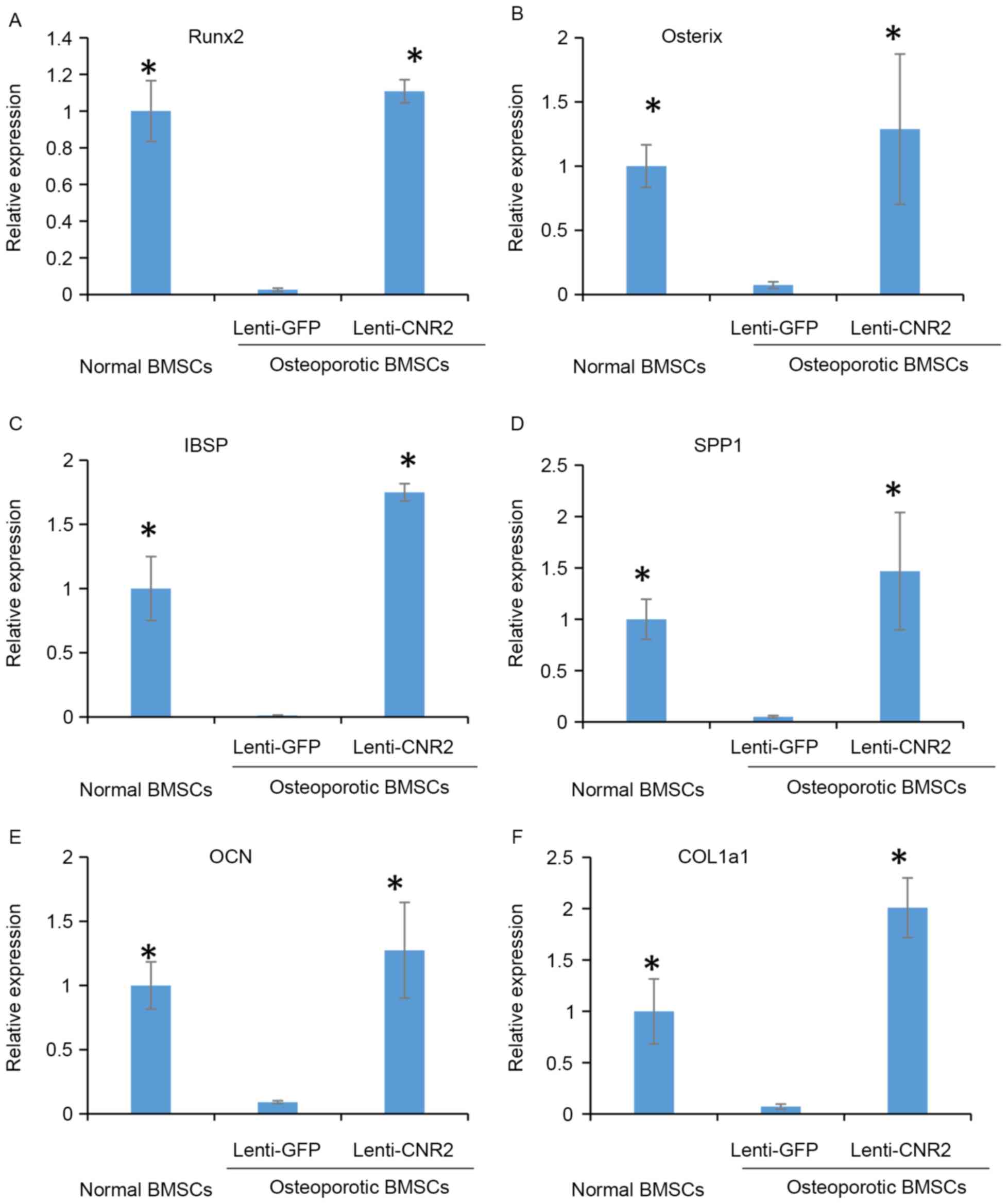 In conclusion, the present study supported that CNR2 in BMSCs is a therapeutic target of osteoporosis and overexpression of CNR2 restores the osteogenic differentiation ability of BMSCs from osteoporotic patients. The present study provided a cellular therapeutic target for osteoporosis, which may lead to the development of more effective drugs in the near future.