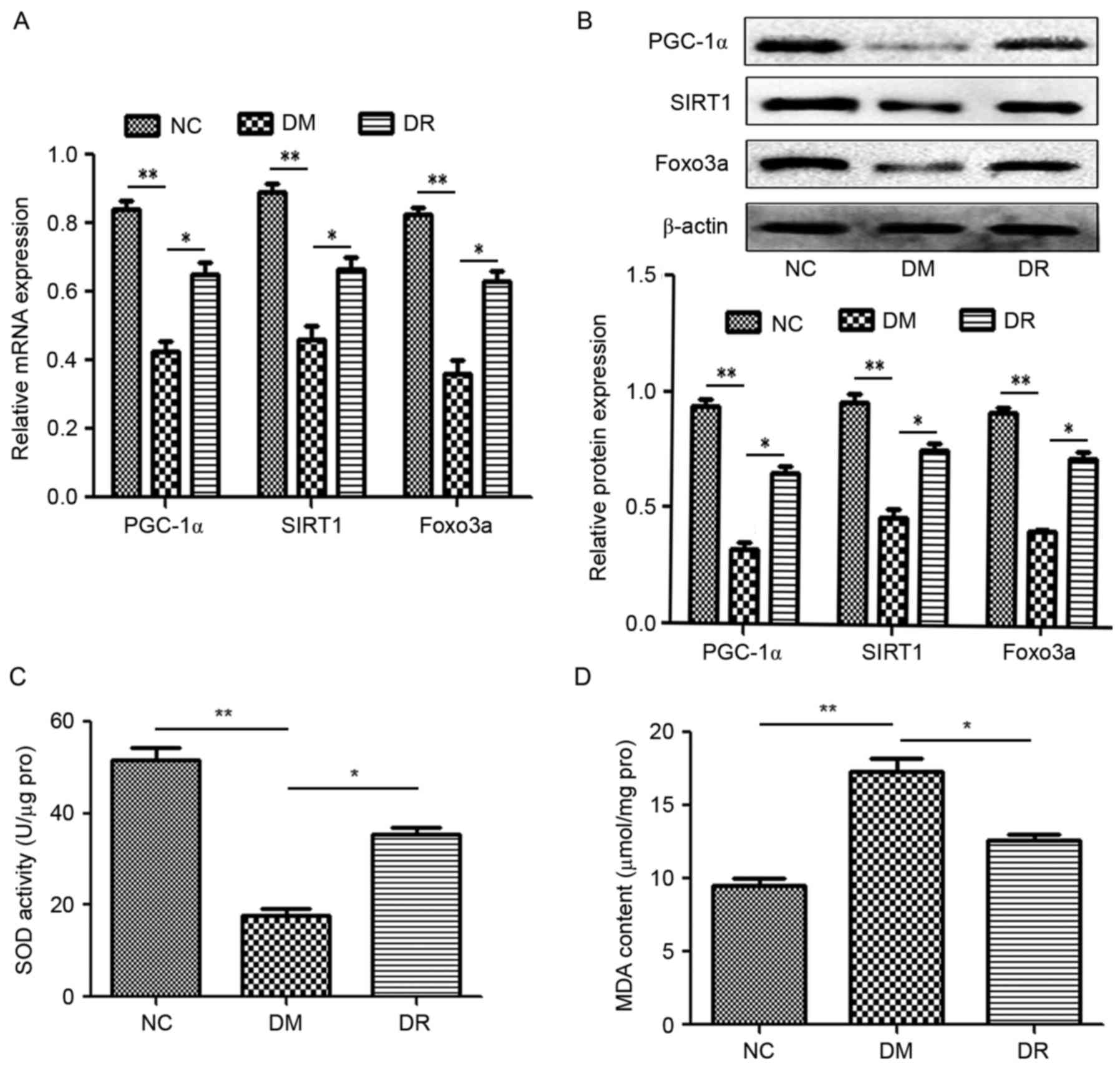 To investigate the mechanism by which RSV functions in DM, levels of PGC-1α, SIRT1 and FOXO3a mRNA and protein were assessed using RT-qPCR and western blotting, respectively. Compared with the NC group, levels of PGC-1α, SIRT1 and FOXO3a mRNA and protein were significantly suppressed in the DM group (P<0.01; Fig. 1A and B). However, pretreatment with RSV significantly attenuated these decreases (P<0.05; Fig. 1A and B). These data suggest that RSV administration upregulates PGC-1α, SIRT1 and FOXO3a expression in mice with STZ-induced DM.