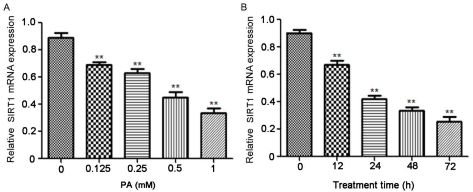 It has been demonstrated that PA serves a role in the development of obesity and T2DM (17). Varying concentrations of PA were used to treat INS-1E cells and the results indicated that PA significantly suppressed SIRT1 mRNA in a dose-dependent manner (P<0.01; Fig. 2A). The association between SIRT1 expression and PA induction time was subsequently investigated and the results indicate that PA treatment also significantly reduced SIRT1 mRNA expression in a time-dependent manner (P<0.01; Fig. 2B).