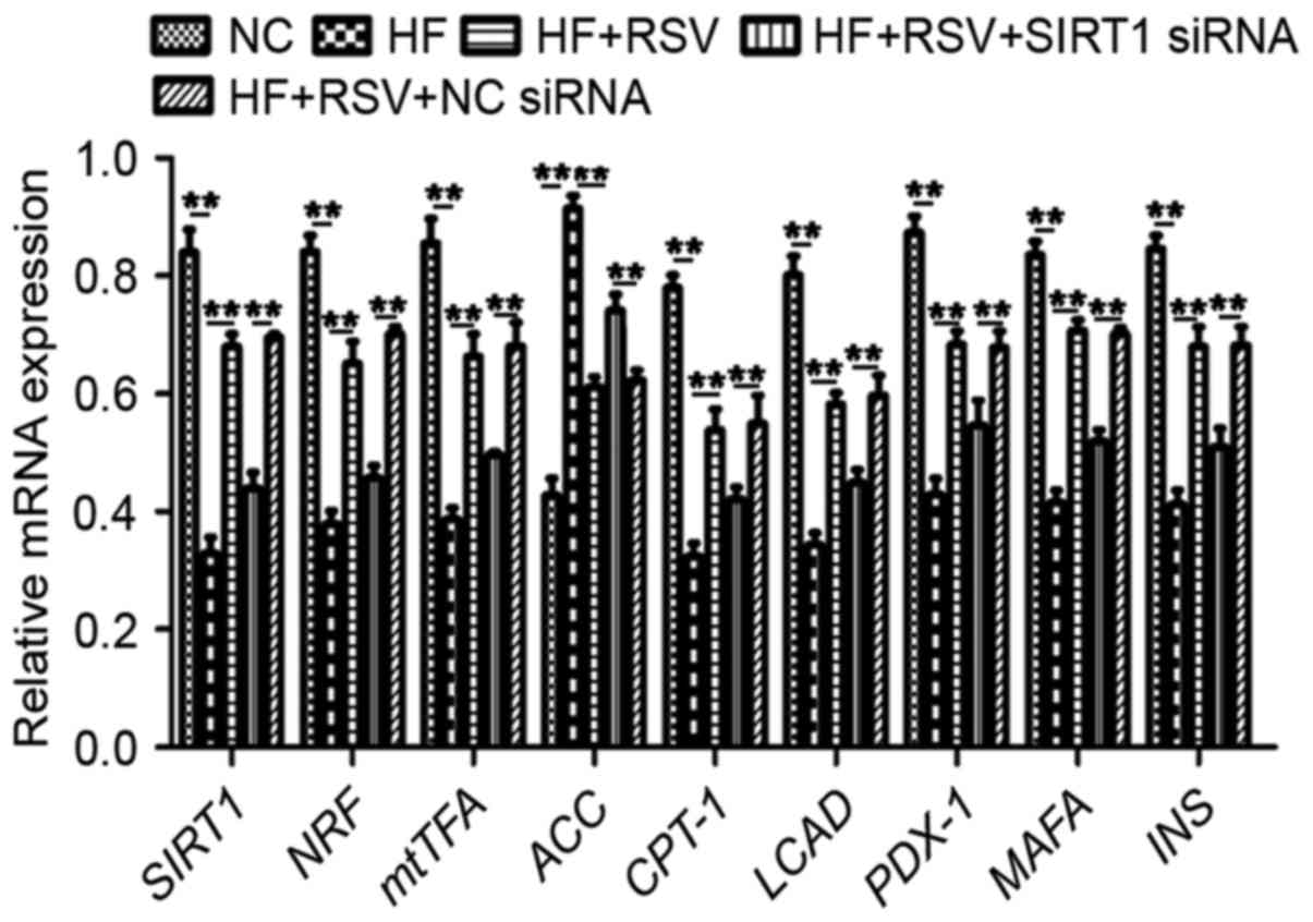 To examine the mechanism by which SIRT1 functions, the expression of a cascade of genes was investigated, including mitochondrial biogenesis-associated NRF and mtTFA, lipid metabolism-associated CPT-1, ACC and LCAD, and β-cells-associated PDX-1, MAFA and INS. PA treatment significantly suppressed mRNA levels of SIRT1, NRF, mtTFA, CPT-1, LCAD, PDX-1, MAFA and INS mRNA, whereas it significantly upregulated the expression of ACC mRNA compared with the NC group (P<0.01; Fig. 4). Treatment with RSV significantly attenuated these PA-induced alterations in gene expression (P<0.01; Fig. 4). However, SIRT1 knockdown significantly attenuated the PA-induced increases in SIRT1, NRF, mtTFA, CPT-1, LCAD, PDX-1, MAFA and INS expression as well as the PA-induced decrease in ACC expression compared with the HF+RSV+NC siRNA group (P<0.01; Fig. 4). These data suggest that RSV modulates the expression of NRF, mtTFA, CPT-1, LCAD, PDX-1, MAFA and INS via SIRT1 in PA-induced INS-1E cells.
