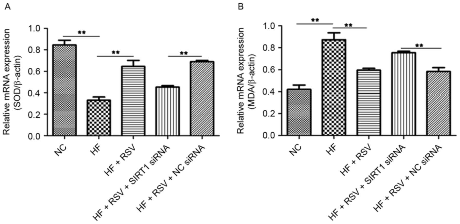 The expression of SOD and MDA mRNA in INS-1E cells following SIRT1 knockdown was assessed to determine the effect of SIRT1 on oxidative stress. Compared with the NC group, PA significantly suppressed SOD mRNA expression (P<0.01; Fig. 5A) and RSV treatment significantly reversed this effect (P<0.01; Fig. 5A). However, SIRT1 knockdown significantly decreased SOD expression compared with the HF+RSV+NC siRNA group (P<0.01; Fig. 5A). The administration of PA significantly increased MDA expression compared with the NC group (P<0.01; Fig. 5B) and RSV significantly attenuated this upregulation (P<0.01; Fig. 5B). SIRT1 knockdown significantly upregulated MDA mRNA expression compared with the HF+RSV+NC siRNA group (P<0.01; Fig. 5B). These data indicate that RSV regulates SOD and MDA levels via SIRT1 in PA-treated INS-1E cells.