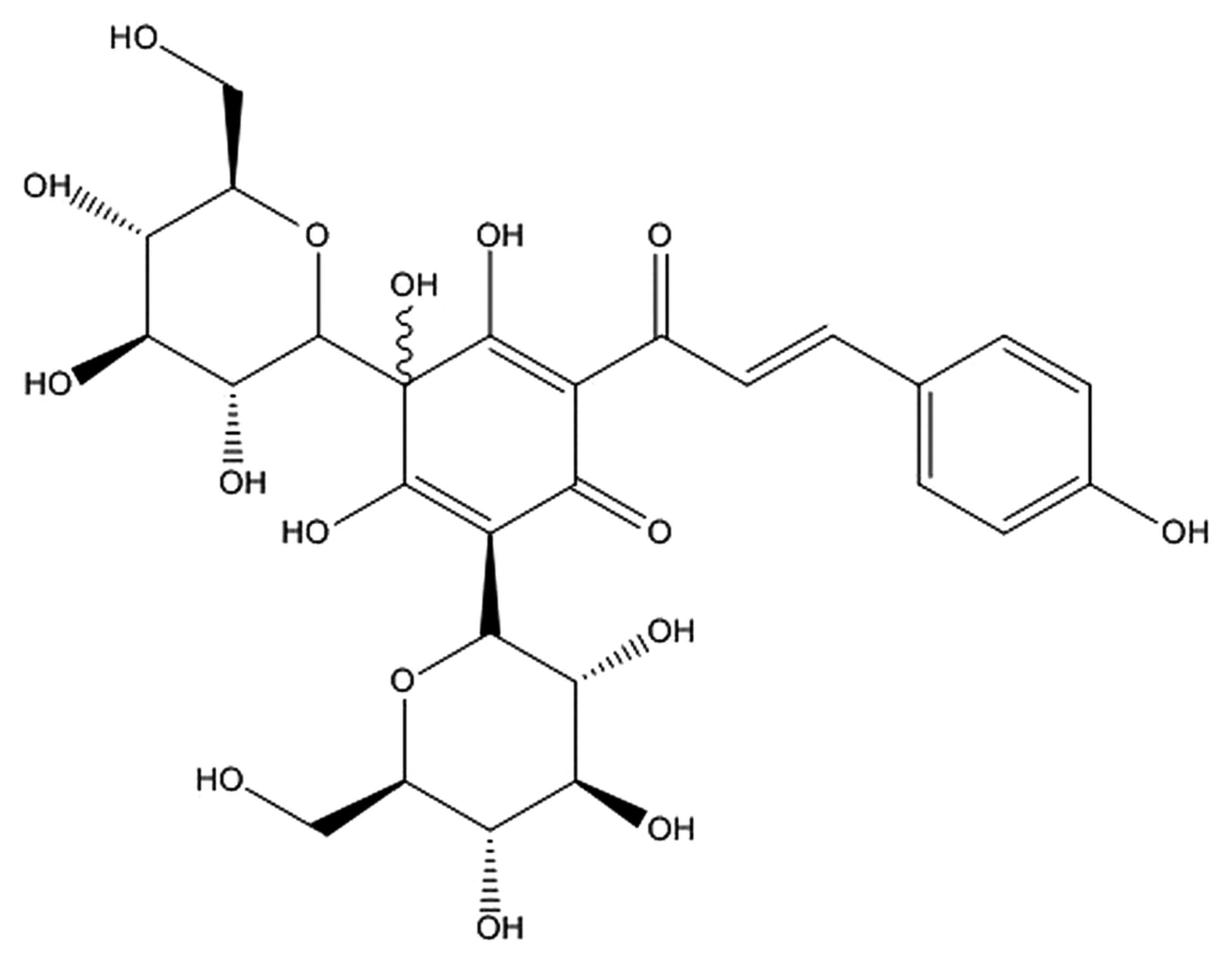 A total of 30 Bama miniature swine were randomly divided into four groups as follows: Sham group (sham; n=6), coronary heart disease model group (model; n=8), low dose HSYA group (HSYA-L; n=8) and high dose HSYA group (HSYA-H; n=8). Swine in the sham and model groups were lavaged with normal saline. Swine in the HSYA-L and HSYA-H groups were lavaged with 20 or 40 mg/kg of HSYA, respectively, for 6 h. HSYA was purchased from Shanxi Huahui Kai Tak Pharmaceutical Co., Ltd. (Shanxi, China) and its chemical structure is shown in Fig. 1.