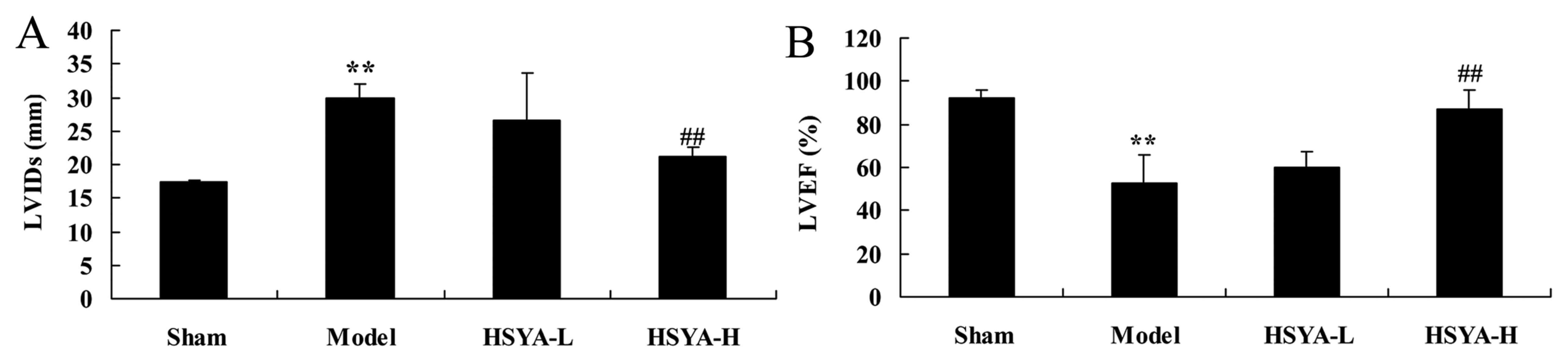 Compared with the swine in the sham group, the LVIDs level of the model group was significantly increased (P<0.01; Fig. 2A). The LVEF were significantly lower in the model group compared with the shame group (P<0.01; Fig. 2B). Treatment with a high dose of HSYA was able to significantly reverse this effect (P<0.01; Fig 2A and B).