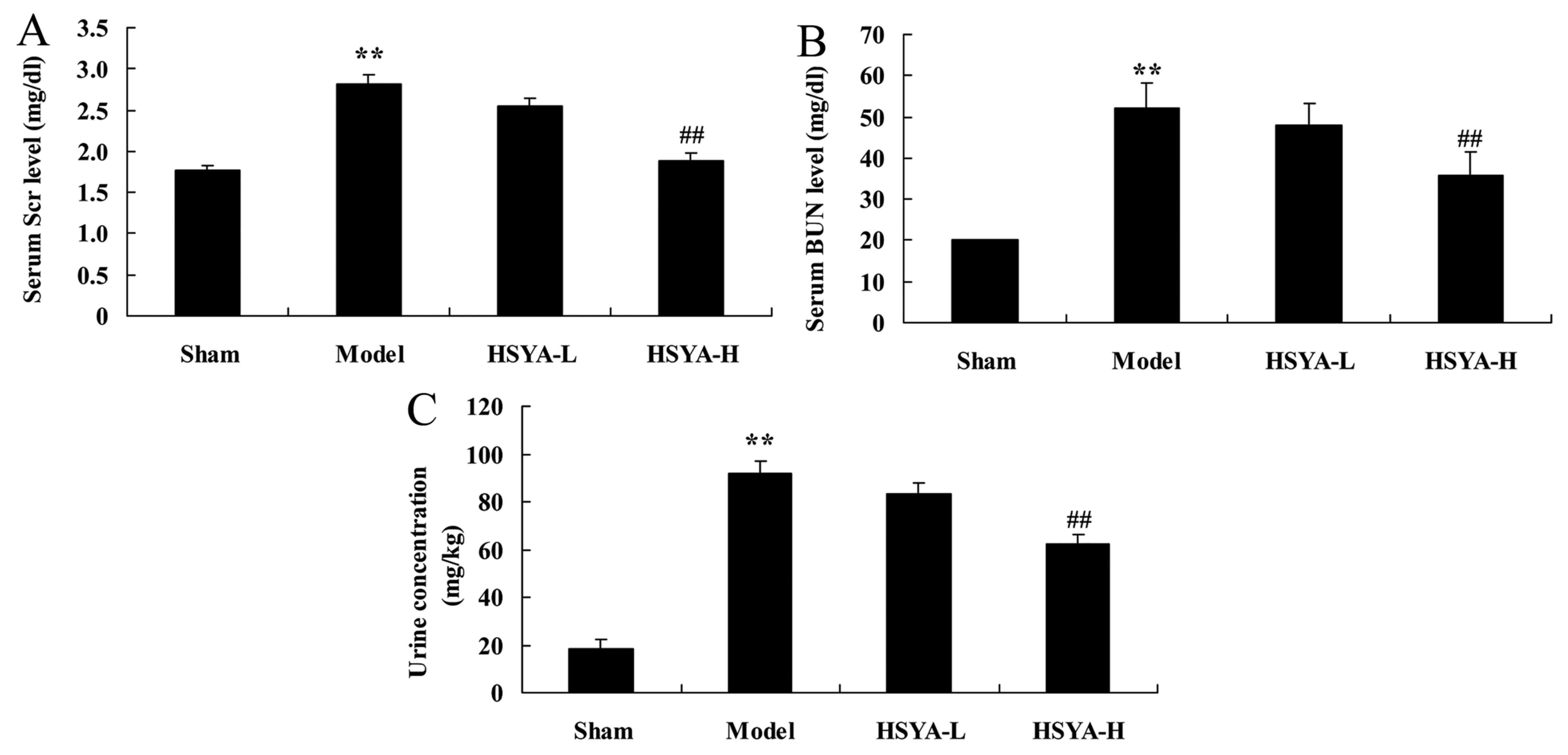 Following 6 h of treatment, a significant increase was observed in levels of Scr (P<0.01; Fig. 3A) BUN (P<0.01; Fig. 3B), and urine concentration (P<0.01; Fig. 3C) in the model group compared with the sham group. Treatment with high-does HSYA, however, significantly ameliorated these effects (all P<0.01; Fig. 3).